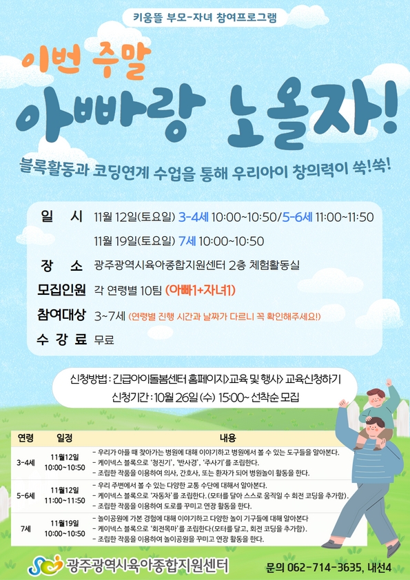 home 맘편한 내★일, 광주아이키움2.0 결혼·임신·출생 영유아 초·중·고 다양한 가족 일생활균형 커뮤니티 아동돌봄지원 소통방 나눔방 광주 아이키움 상담방 돌봄정보방 성폭력 피해 상담 및 사건지원 공지사항 우리동네 돌봄정보 기관별 공지사항 [광주육아종합지원센터] 아빠랑 노올자! 아빠-자녀 참여프로그램(블럭놀이&코딩) 3-7세까지! 등록일 : 2022-10-25 18:59 작성자 : 광주육아종합지원센터 조회수 : 240 첨부파일 아빠랑 노올자.jpg 다운로드 연령별 일정이 다른점 확인하시어 신청해주세요~ 목록