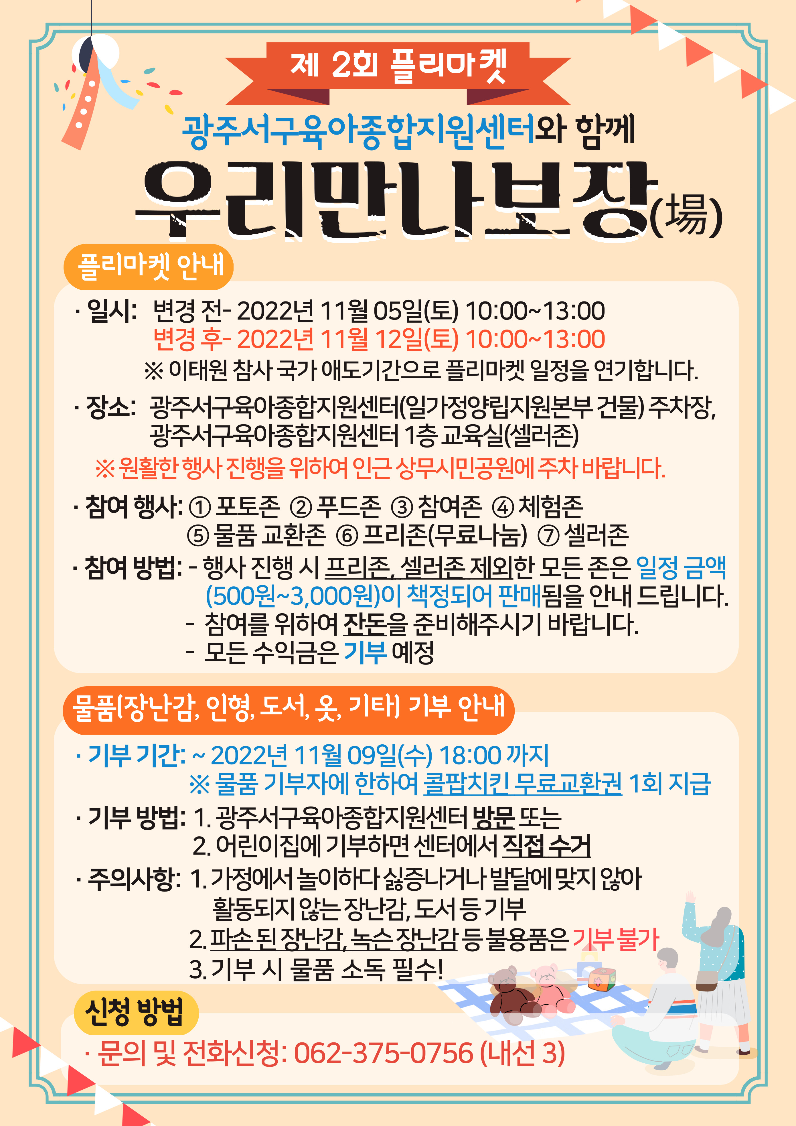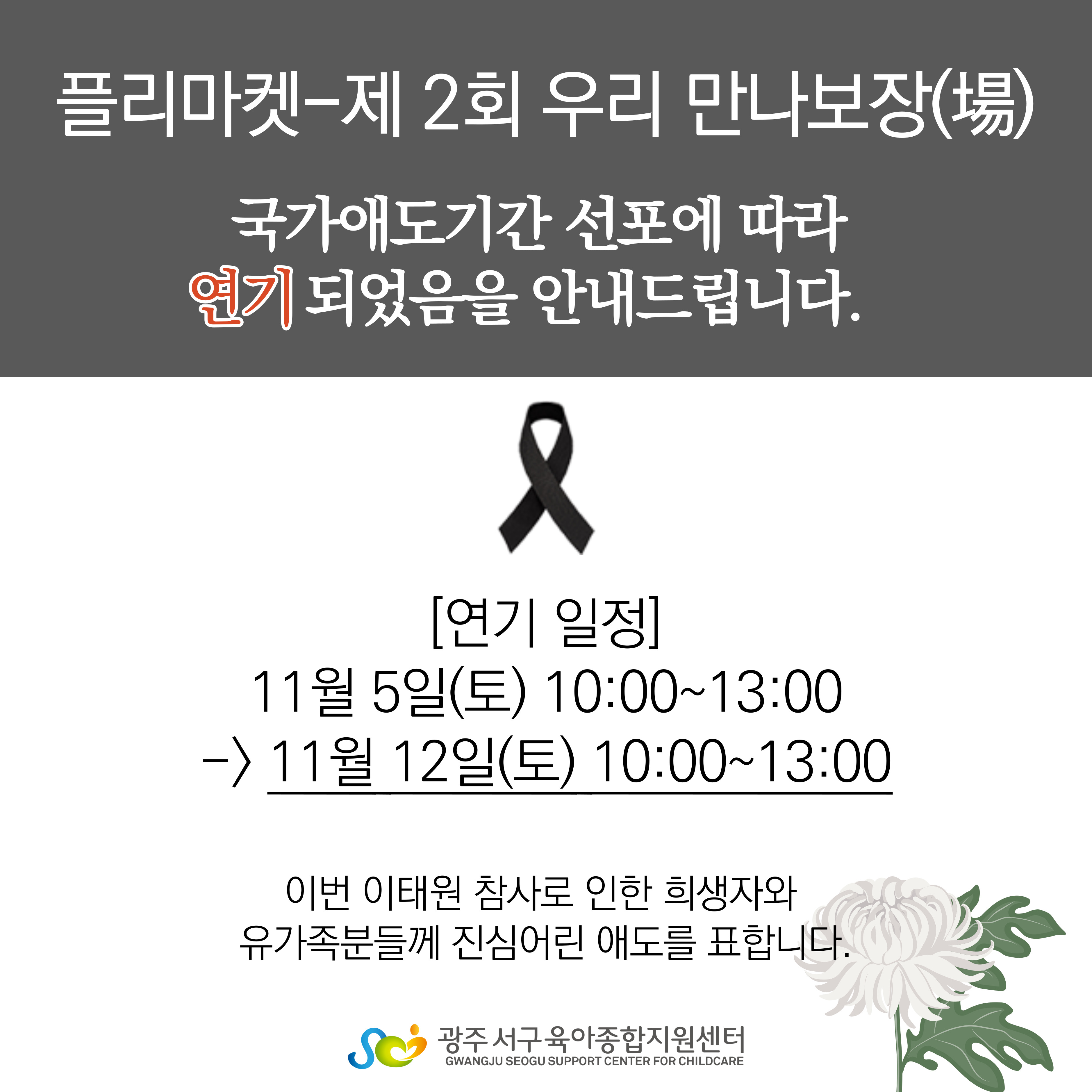 home 맘편한 내★일, 광주아이키움2.0 결혼·임신·출생 영유아 초·중·고 다양한 가족 일생활균형 커뮤니티 아동돌봄지원 소통방 나눔방 광주 아이키움 상담방 돌봄정보방 성폭력 피해 상담 및 사건지원 공지사항 우리동네 돌봄정보 기관별 공지사항 [광주서구육아종합지원센터] 플리마켓-제 2회 우리 만나보장(場) 연기 안내 등록일 : 2022-10-31 16:52 작성자 : 서구육아종합지원센터 조회수 : 198 이태원 참사로 인한 국가애도기간 선포에 따라11월 05일(토) 10:00~13:00 진행 예정이었던플리마켓- 제 2회 우리 만나보장(場)이 연기되었음을 안내드립니다.희생자와 유가족분들께 진심어린 애도를 표합니다.변경 전 2022년 11월 05일(토) 10:00~13:00변경 후 2022년 11월 12일(토) 10:00~13:00 목록