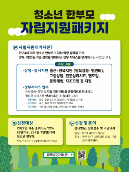 : 만24세 이하 청소년 한부모의 자립 역량 강화를 위해 양육, 취업 등 각종 정보를 안내하고 정부서비스를 연계해주는 사업입니다.