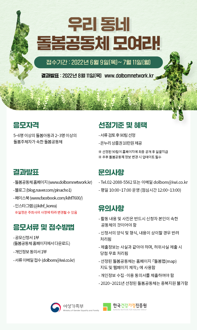 home 맘편한 내★일, 광주아이키움2.0 결혼·임신·출생 영유아 초·중·고 다양한 가족 일생활균형 커뮤니티 아동돌봄지원 소통방 나눔방 광주 아이키움 상담방 돌봄정보방 성폭력 피해 상담 및 사건지원 공지사항 우리동네 돌봄정보 기관별 공지사항 광주남구가족센터 <신규돌봄공동체> 모집 안내 등록일 : 2022-06-14 09:13 작성자 : 남구가족센터 조회수 : 188 첨부파일 우리 동네 돌봄공동체 모여라 세부내용 및 참가신청서(+개인정보동의서).hwp 다운로드 광주남구가족센터 내 돌봄돌봄공동체에서신규 돌봄공동체를 모집하고 있습니다.자세한 내용은 알림방을 참고해 주시고관심있는 분들의 적극적인 참여 바랍니다~^^ 목록