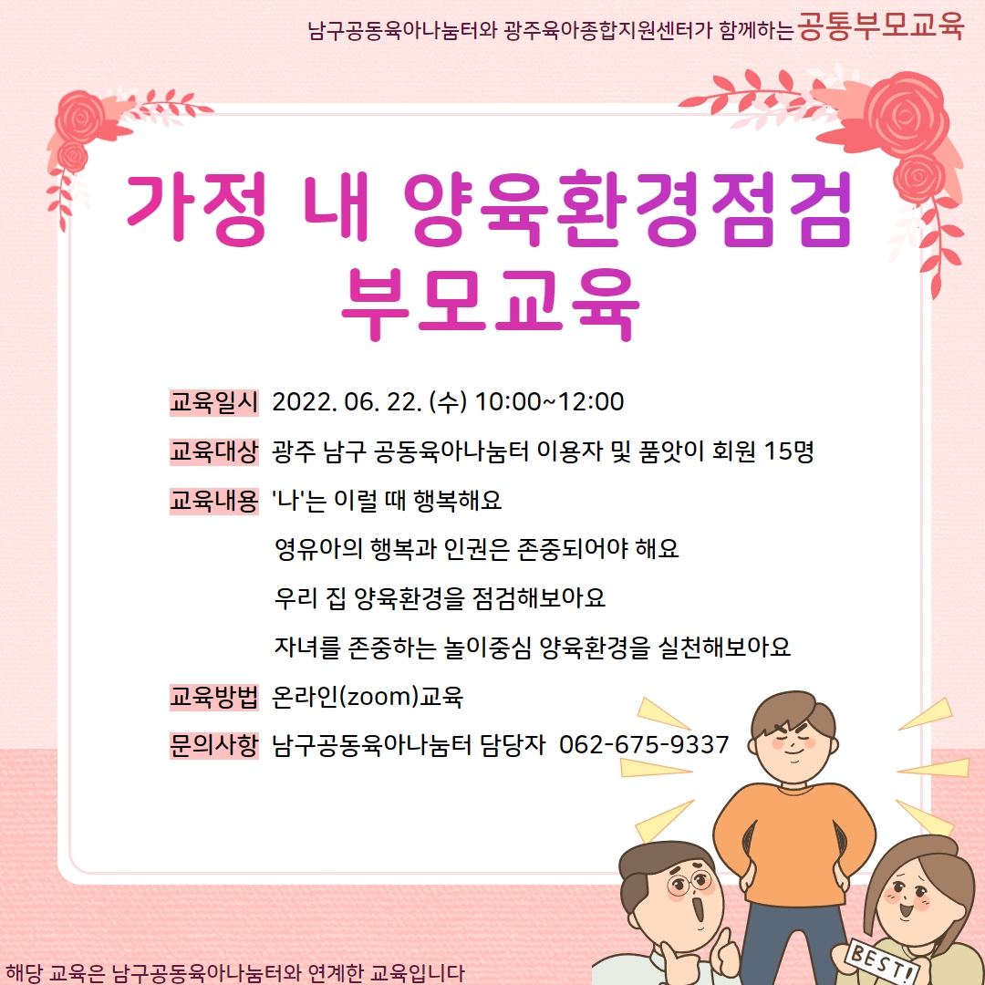 home 맘편한 내★일, 광주아이키움2.0 결혼·임신·출생 영유아 초·중·고 다양한 가족 일생활균형 커뮤니티 아동돌봄지원 소통방 나눔방 광주 아이키움 상담방 돌봄정보방 성폭력 피해 상담 및 사건지원 공지사항 우리동네 돌봄정보 기관별 공지사항 광주남구공동육아나눔터 공통부모교육 < 가정 내 양육환경점검 부모교육> 모집 안내 등록일 : 2022-06-09 15:18 작성자 : 남구가족센터 조회수 : 172 광주육아종합지원센터와 남구공동육아나눔터가 함께하는 공통부모교육 참여를 희망하시는 분들께서는공동육아나눔터 2호점 담당자(062-675-9337)에게 연락 주시면 감사하겠습니다. 목록
