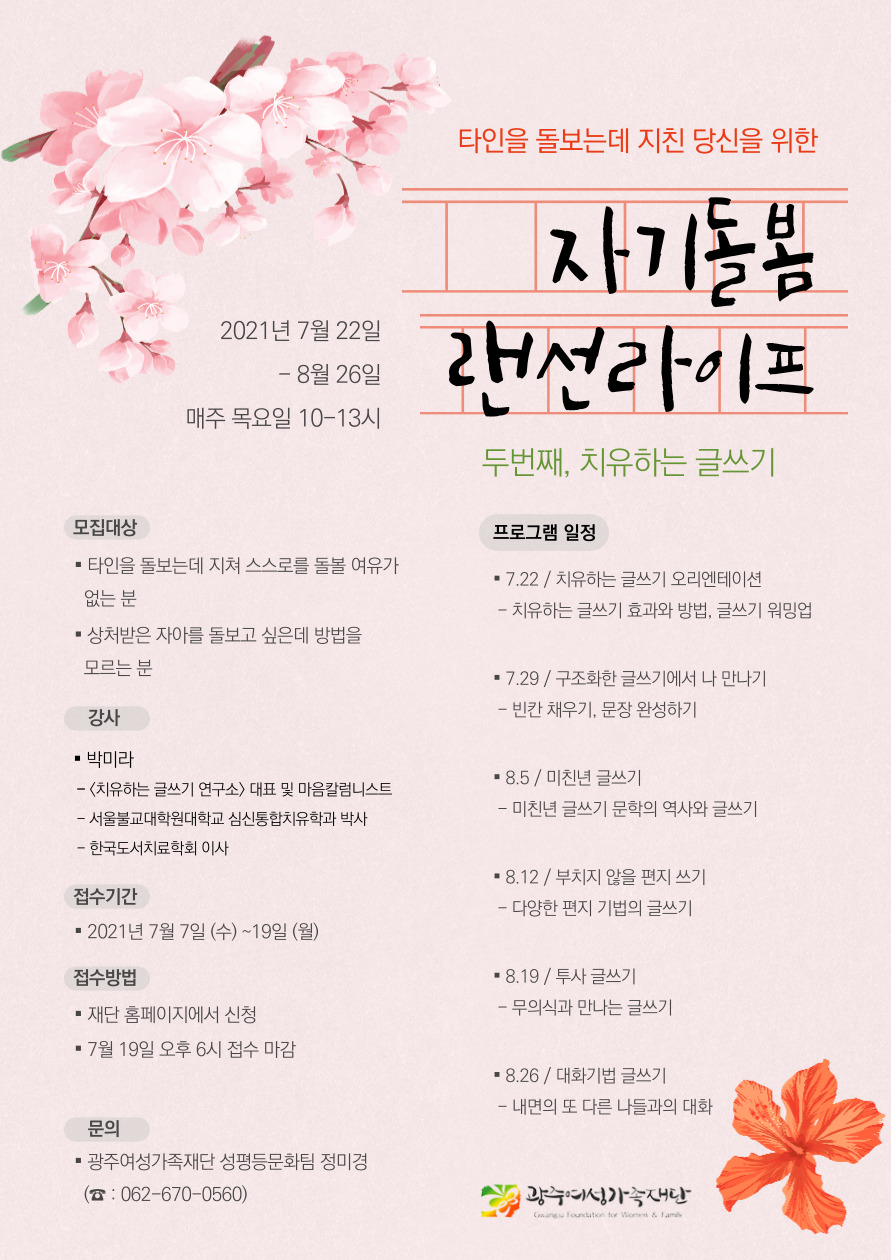 〇 광주여성가족재단에서는 2020년부터 코로나19 시대의 비일상적 상황에 지친 광주시민을 위해 ‘자기돌봄’을 주제로 한 자아탐구 프로그램을 진행해왔습니다. 이 프로그램은 글쓰기와 연극, 타로카드, 명상 등 다양한 문화예술 장르를 활용한 자아 탐구의 여정을 통해 치유와 성장을 이끌어냄으로써, 여성에게 부과된 돌봄의 의무에서 잠시 벗어나 스스로를 돌봄으로써 자기 내면의 힘을 긍정하는 임파워먼트 경험을 제공합니다.