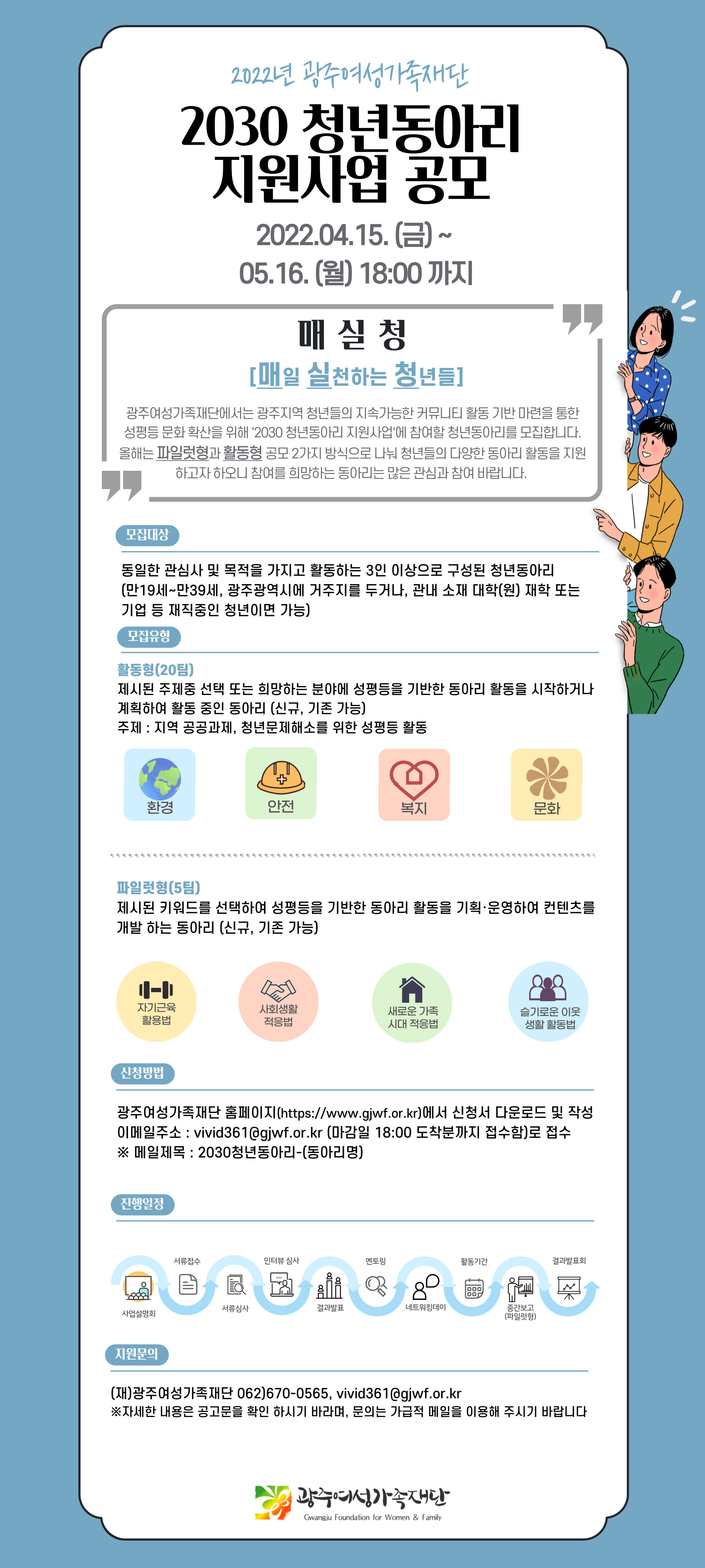 home 맘편한 내★일, 광주아이키움2.0 결혼·임신·출생 영유아 초·중·고 다양한 가족 일생활균형 커뮤니티 아동돌봄지원 소통방 나눔방 광주 아이키움 상담방 돌봄정보방 성폭력 피해 상담 및 사건지원 공지사항 우리동네 돌봄정보 기관별 공지사항 [광주여성가족재단] 2030 청년동아리 지원사업 '매실청' 도전하자!! 등록일 : 2022-05-10 16:53 작성자 : 운영자 조회수 : 351 첨부파일 [공고문] 2030 청년동아리 모집공고.pdf 다운로드 첨부파일 [신청서] 청년동아리 공모(활동형).hwp 다운로드 첨부파일 [신청서] 청년동아리 공모(파일럿형).hwp 다운로드 목록