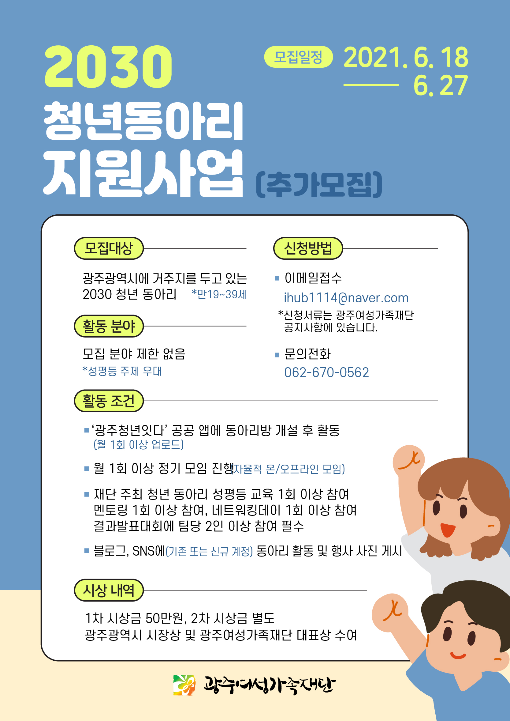 광주여성가족재단에서는 광주지역 청년들의 지속가능한 커뮤니티 활동 기반 마련을 통한 성평등 문화 확산을 위해 ‘2030 청년동아리 지원사업’에 참여할 청년동아리를 모집합니다. 참여를 희망하는 동아리는 많은 관심과 참여 바랍니다.
