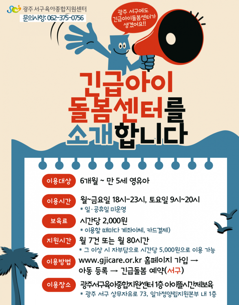 home 맘편한 내★일, 광주아이키움2.0 결혼·임신·출생 영유아 초·중·고 다양한 가족 일생활균형 커뮤니티 아동돌봄지원 소통방 나눔방 광주 아이키움 상담방 돌봄정보방 성폭력 피해 상담 및 사건지원 공지사항 우리동네 돌봄정보 기관별 공지사항 광주서구육아종합지원센터에서 긴급아이돌봄센터를 운영합니다. 등록일 : 2021-06-24 10:09 작성자 : 운영자 조회수 : 527 광주서구육아종합지원센터에서 긴급아이돌봄센터를 운영합니다.자세한 사항은 팜플렛, 홈페이지를 참고하여 주시기 바랍니다.홈페이지https://www.gjicare.or.kr/관련 문의사항은 센터(062-375-0756)로 연락주시기 바랍니다. 목록