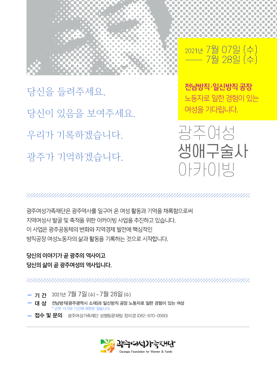 home 맘편한 내★일, 광주아이키움2.0 결혼·임신·출생 영유아 초·중·고 다양한 가족 일생활균형 커뮤니티 아동돌봄지원 소통방 나눔방 광주 아이키움 상담방 돌봄정보방 성폭력 피해 상담 및 사건지원 공지사항 우리동네 돌봄정보 기관별 공지사항 광주여성생애구술사 아카이빙 등록일 : 2021-07-09 15:36 작성자 : 운영자 조회수 : 365 ◯ 제목 : 방직 공장 노동자의 일경험을 들려줄 구술자 모집 ◯ 기간 : 2021년 7월 8일 (목) ~ 7월 28일 (수) ◯ 대상 : 전남방직(광주광역시 소재)과 일신방직 공장 노동자로 일한 경험이 있는 여성 * 근무 시기와 기간에 제한은 없습니다. ◯ 문의 및 신청 : 광주여성가족재단 성평등문화팀 정미경(062-670-0560) 목록