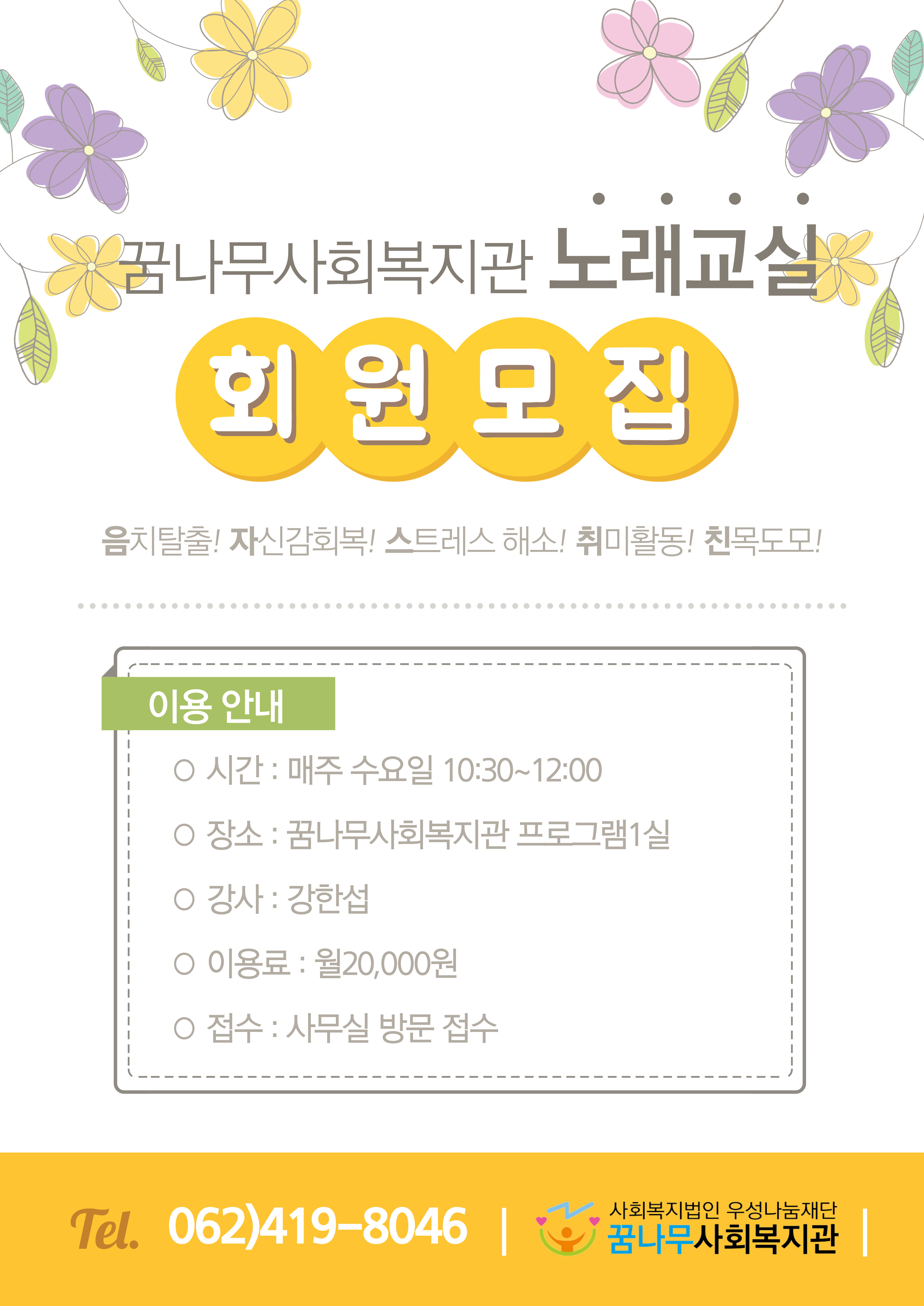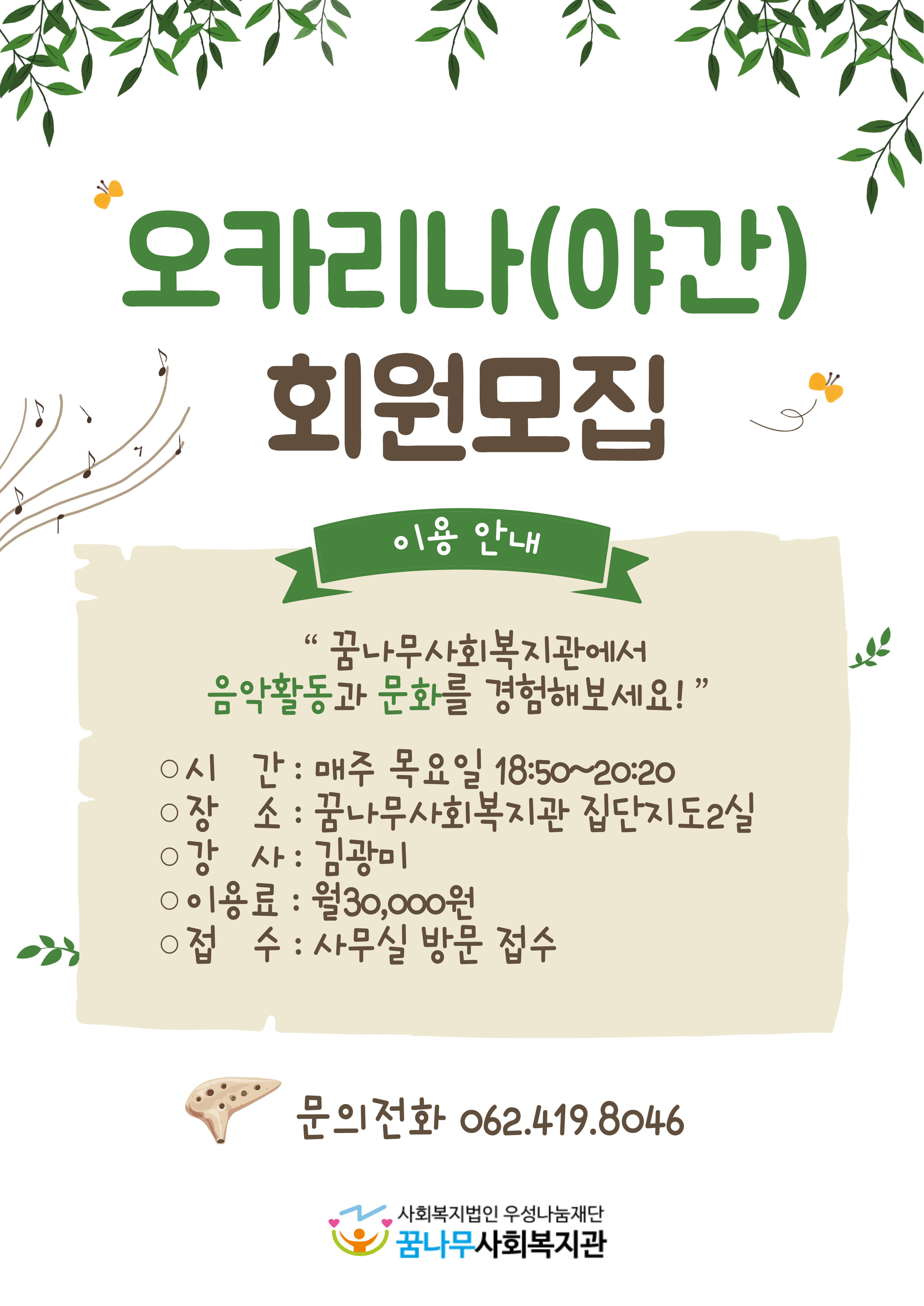 현재 오카리나(야간), 노래교실, 캘리그라피 회원을 모집하고 있으니 많은 관심과 참여 부탁드립니다.