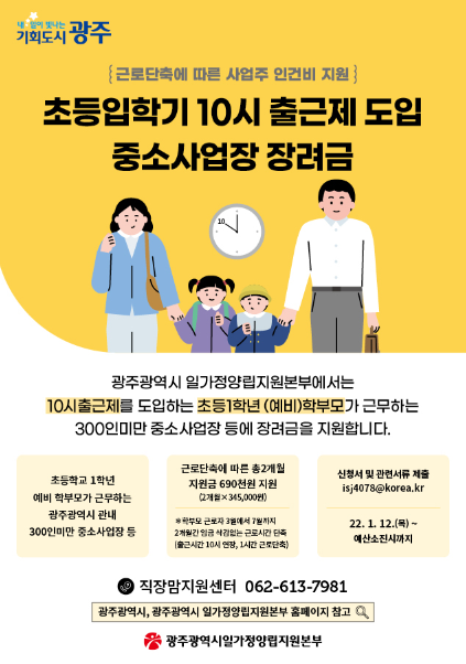 광주광역시 일가정양립지원본부에서는「 `23년 초등입학기 10시 출근제 도입 중소사업장 장려금」