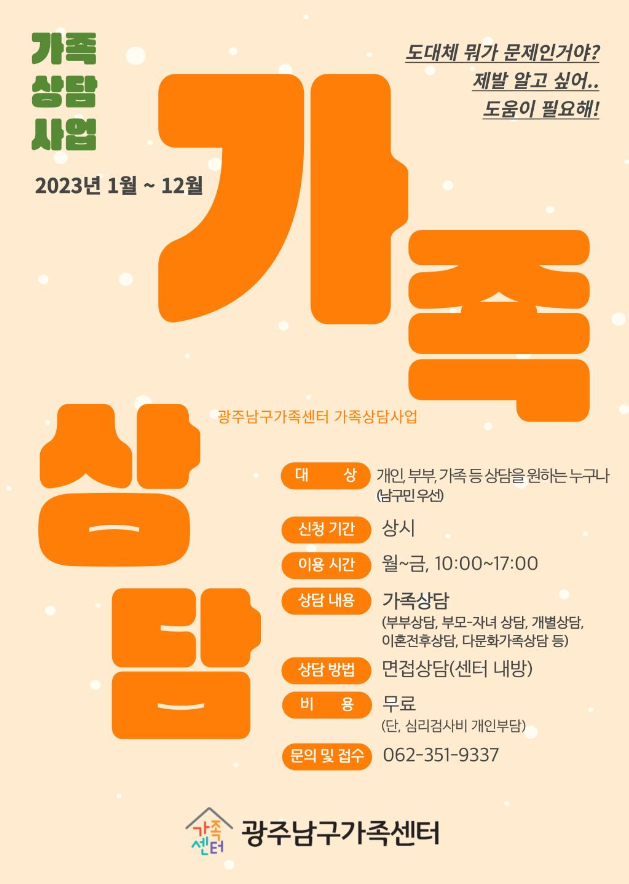 home 맘편한 내★일, 광주아이키움2.0 결혼·임신·출생 영유아 초·중·고 다양한 가족 일생활균형 커뮤니티 아동돌봄지원 소통방 나눔방 광주 아이키움 상담방 돌봄정보방 성폭력 피해 상담 및 사건지원 공지사항 우리동네 돌봄정보 기관별 공지사항 [남구가족센터] 가족상담사업 안내 등록일 : 2023-01-20 11:21 작성자 : 운영자 조회수 : 157 개인, 부부, 가족 등 상담을 원하는 모든 분들께 도움을 드리고자 2023년 가족상담 사업을 실시합니다. 가장 가까운 가족이 가장 멀어지는 순간, 나를 돌아봐야하는 순간, 도움이 필요한 순간그 모든 순간에 남구가족센터가 함께합니다. 상담기간 2023-01 ~12참여대상 개인, 부부, 가족 등 상담을 원하는 누구나 (남구민 우선)참가비용 무료진행문의 062-351-9337 (장소 : 남구가족센터 상담실) 목록