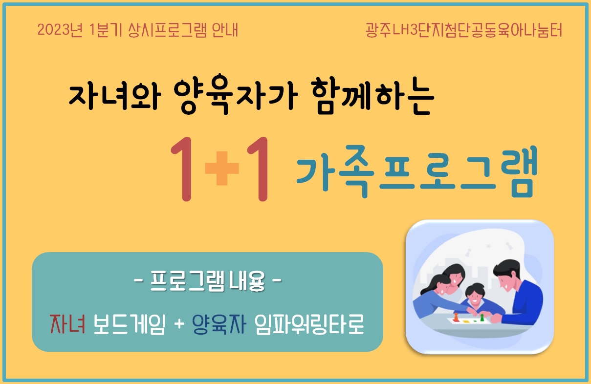 home 맘편한 내★일, 광주아이키움2.0 결혼·임신·출생 영유아 초·중·고 다양한 가족 일생활균형 커뮤니티 아동돌봄지원 소통방 나눔방 광주 아이키움 상담방 돌봄정보방 성폭력 피해 상담 및 사건지원 공지사항 우리동네 돌봄정보 기관별 공지사항 [2023년 1분기 첨단공동육아나눔터 3월 상시프로그램 안내] 등록일 : 2023-02-22 17:55 작성자 : 운영자 조회수 : 135 [2023년 1분기 첨단공동육아나눔터 3월 상시프로그램 안내]자녀와 양육자가 함께하는 1+1 가족프로그램내용 : 자녀 보드게임+양육자 임파워링타로신청하기 → https://forms.gle/w9yqVTvRGbuUBVdM9 목록