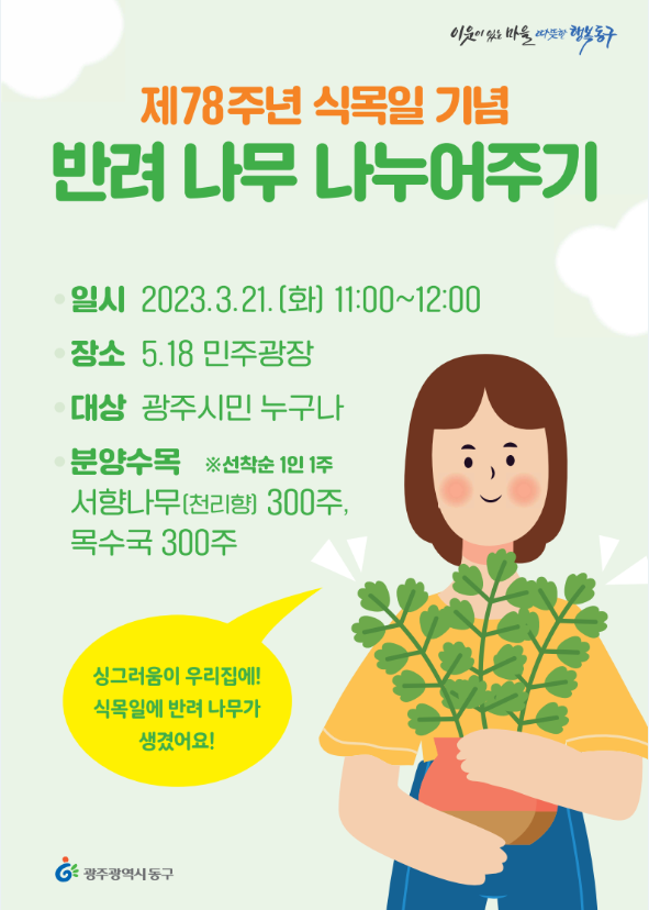 제78회 식목일을 맞이하여 「반려 나무 나누어주기」 행사를 개최하오니 주민 여러분의 많은 참여 바랍니다.