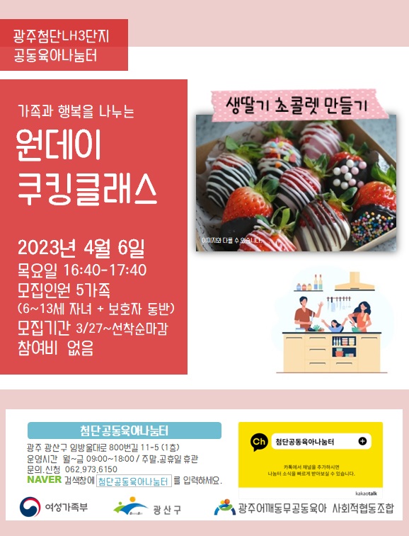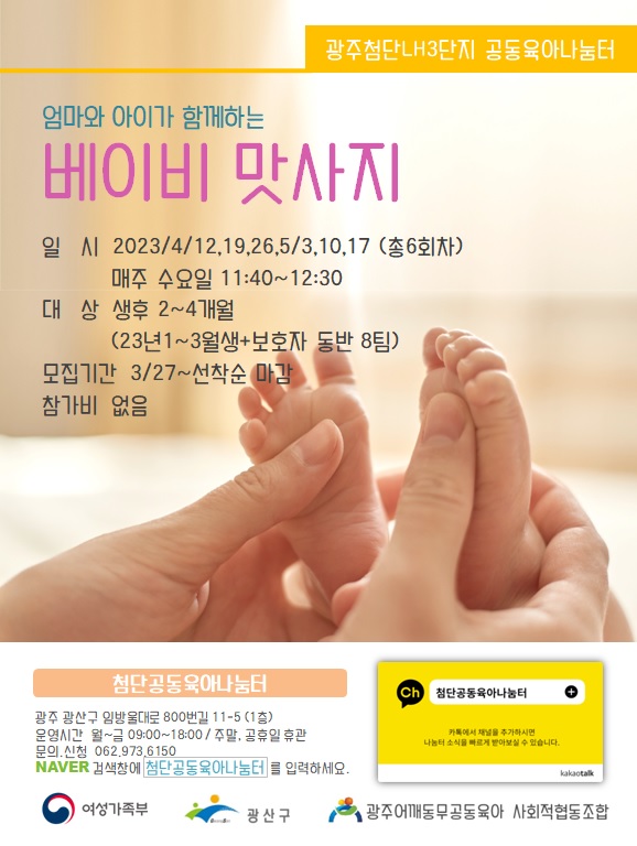 home 맘편한 내★일, 광주아이키움2.0 결혼·임신·출생 영유아 초·중·고 다양한 가족 일생활균형 커뮤니티 아동돌봄지원 소통방 나눔방 광주 아이키움 상담방 돌봄정보방 성폭력 피해 상담 및 사건지원 공지사항 우리동네 돌봄정보 기관별 공지사항 첨단공동육아나눔터 상시프로그램 안내 등록일 : 2023-03-27 11:34 작성자 : 첨단공동육아나눔터 조회수 : 89 봄봄봄 봄이 왔어요~^^일정 잘 체크하시고 신청해주세요~베이비맛사지 신청하기https://forms.gle/UyXVnR8BoTAZujuM7이야기가 있는 요리놀이 신청하기https://forms.gle/S3E64mk9vxBH8qCu7양육자요가 신청하기https://forms.gle/4vFuV7bPogVwSdALA생딸기초콜렛 신청하기https://forms.gle/dBUfp2ZXx3ckKj3q8 목록