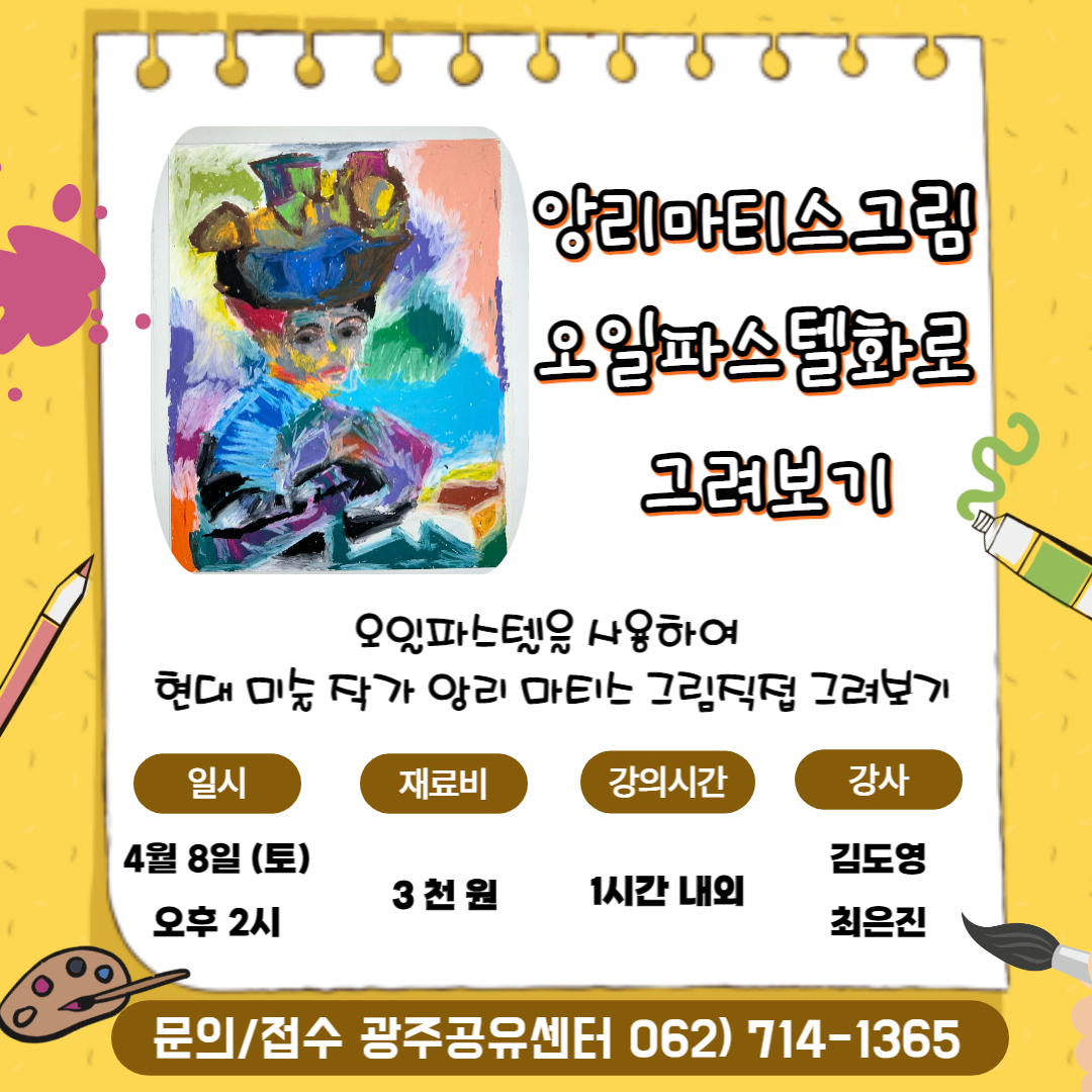 home 맘편한 내★일, 광주아이키움2.0 결혼·임신·출생 영유아 초·중·고 다양한 가족 일생활균형 커뮤니티 아동돌봄지원 소통방 나눔방 광주 아이키움 상담방 돌봄정보방 성폭력 피해 상담 및 사건지원 공지사항 우리동네 돌봄정보 기관별 공지사항 [재능공유] 오일파스텔화 그림그리기 등록일 : 2023-04-04 09:22 작성자 : 광주공유센터 조회수 : 125 멋진 작품을 만들어 보는 건 어떠실까요?오일파스텔을 이용한 앙리마티스그림을 그려보아요~...일시 : 4월 8일 (토) 오후 2시 (1시간 진행)장소 : 광주공유센터 (남구 화산로 30)재료비 : 3천원접수 및 문의는 유선으로 가능합니다.062)714-1365 목록