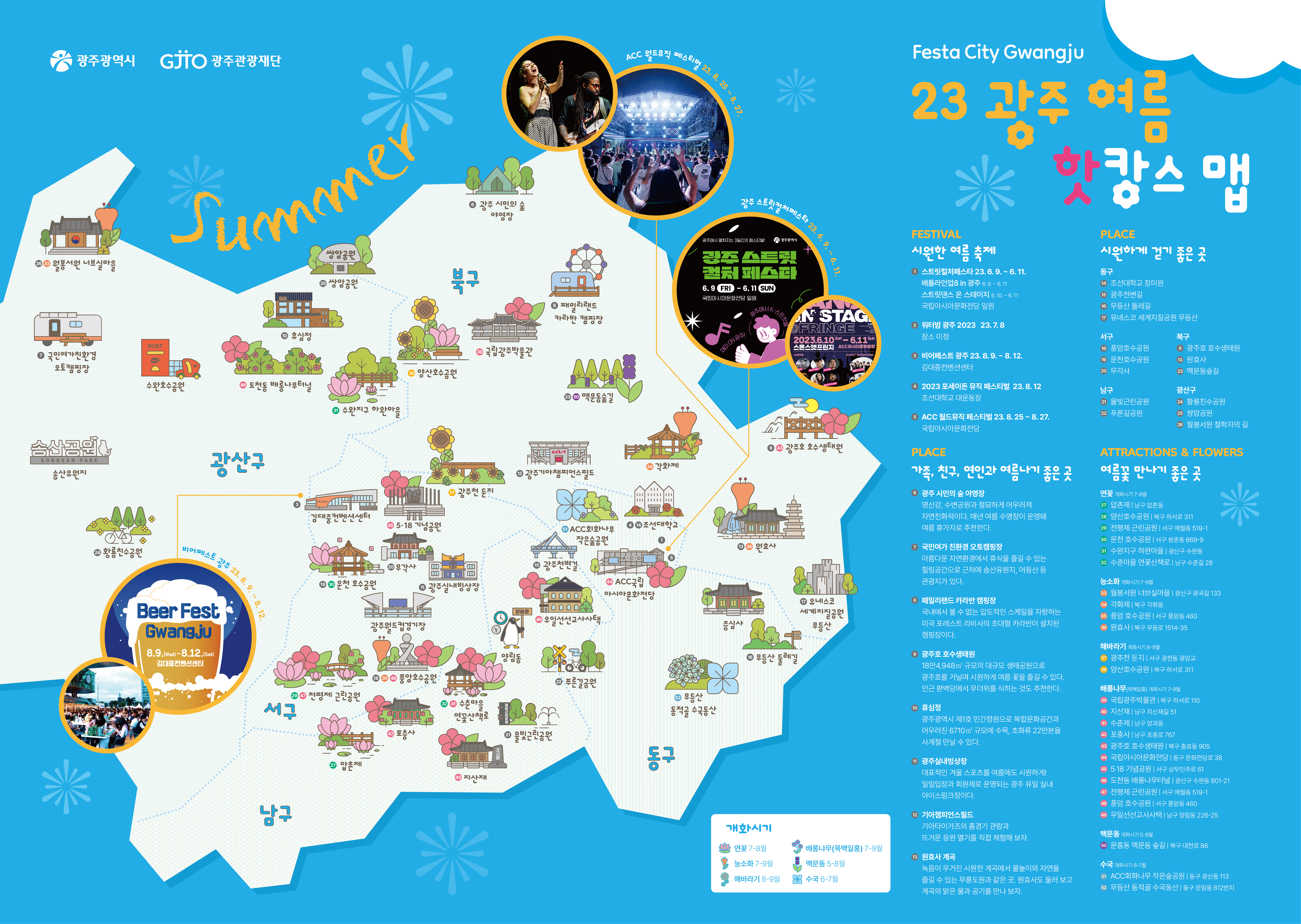 지도에는 ▲연꽃(압촌제, 양산호수공원, 전평제 근린공원) ▲능소화(월봉서원 너브실마을, 각화제) ▲해바라기(광주천 둔치, 양산호수공원) ▲배롱나무(국립광주박물관, 지산재, 수춘제) ▲맥문동(문화근린공원) ▲수국(동적골 수국동산) 등 여름꽃 주요 명소가 담겼다.