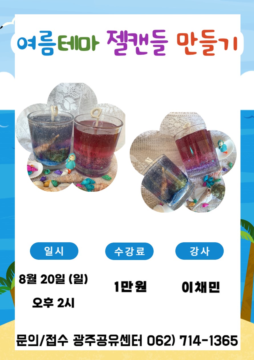 home 맘편한 내★일, 광주아이키움2.0 결혼·임신·출생 영유아 초·중·고 다양한 가족 일생활균형 커뮤니티 아동돌봄지원 소통방 나눔방 광주 아이키움 상담방 돌봄정보방 성폭력 피해 상담 및 사건지원 공지사항 우리동네 돌봄정보 기관별 공지사항 [재능공유] 여름테마 젤캔들 만들기 등록일 : 2023-08-04 11:37 작성자 : 광주공유센터 조회수 : 144 여름과 어울리는 젤캔들을 만들어보아요~!!예쁜 것은 기본!기분 좋은 향은 덤!!지금 바로 신청하세요~!!일시 : 2023년 8월 20일 (일) 오후2시장소 : 광주공유센터 (남구 화산로 30)재료비 : 1만원접수 및 문의는062)714-1365입니다. 목록