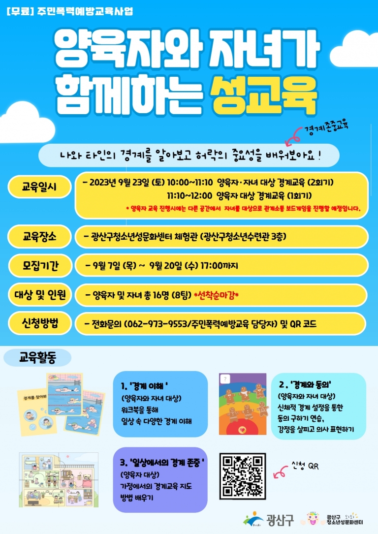 2023년 주민폭력예방교육 사업의 일환으로 양육자와 자녀가 함께하는 성교육 프로그램을 진행 할 예정입니다.