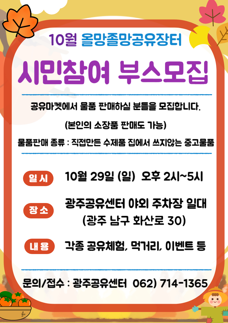 home 맘편한 내★일, 광주아이키움2.0 결혼·임신·출생 영유아 초·중·고 다양한 가족 일생활균형 커뮤니티 아동돌봄지원 소통방 나눔방 광주 아이키움 상담방 돌봄정보방 성폭력 피해 상담 및 사건지원 공지사항 우리동네 돌봄정보 기관별 공지사항 [공지] 10월 올망졸망 공유장터 참여자 모집 등록일 : 2023-10-05 09:35 작성자 : 광주공유센터 조회수 : 89 무더위가 끝나고 시원한 바람이 부는 가을이 왔습니다~!!이번 공유장터는 실내가 아닌지하주차장 일대에서 진행됩니다 ~10월 장터를 빛내주실판매자분들을 모집하고 있습니다 :D...참여를 원하시는 분들은광주공유센터 사무실062)714-1365로연락주세요~ 목록