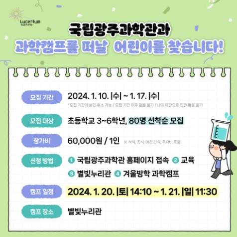 ○ 신청방법 : 국립광주과학관 홈페이지 접속 > 교육 > 별빛누리관 > 겨울방학 과학캠프 '예약하기'