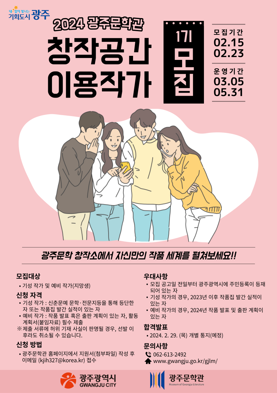 광주문학관은 기성 작가와 예비 작가의 작품 창작을 지원하기 위해 ‘2024년 제1기 창작공간 집필 작가’를 모집한다.
