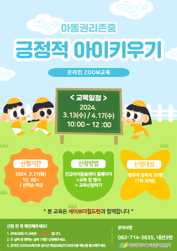 home 맘편한 내★일, 광주아이키움2.0 결혼·임신·출생 영유아 초·중·고 다양한 가족 일생활균형 커뮤니티 아동돌봄지원 소통방 나눔방 광주 아이키움 상담방 돌봄정보방 성폭력 피해 상담 및 사건지원 공지사항 우리동네 돌봄정보 기관별 공지사항 [부모교육] 긍정적 아이키우기(아동권리존중 부모교육) 등록일 : 2024-02-22 00:00 작성자 : 운영자 조회수 : 76 2.jpg 다운로드 목록