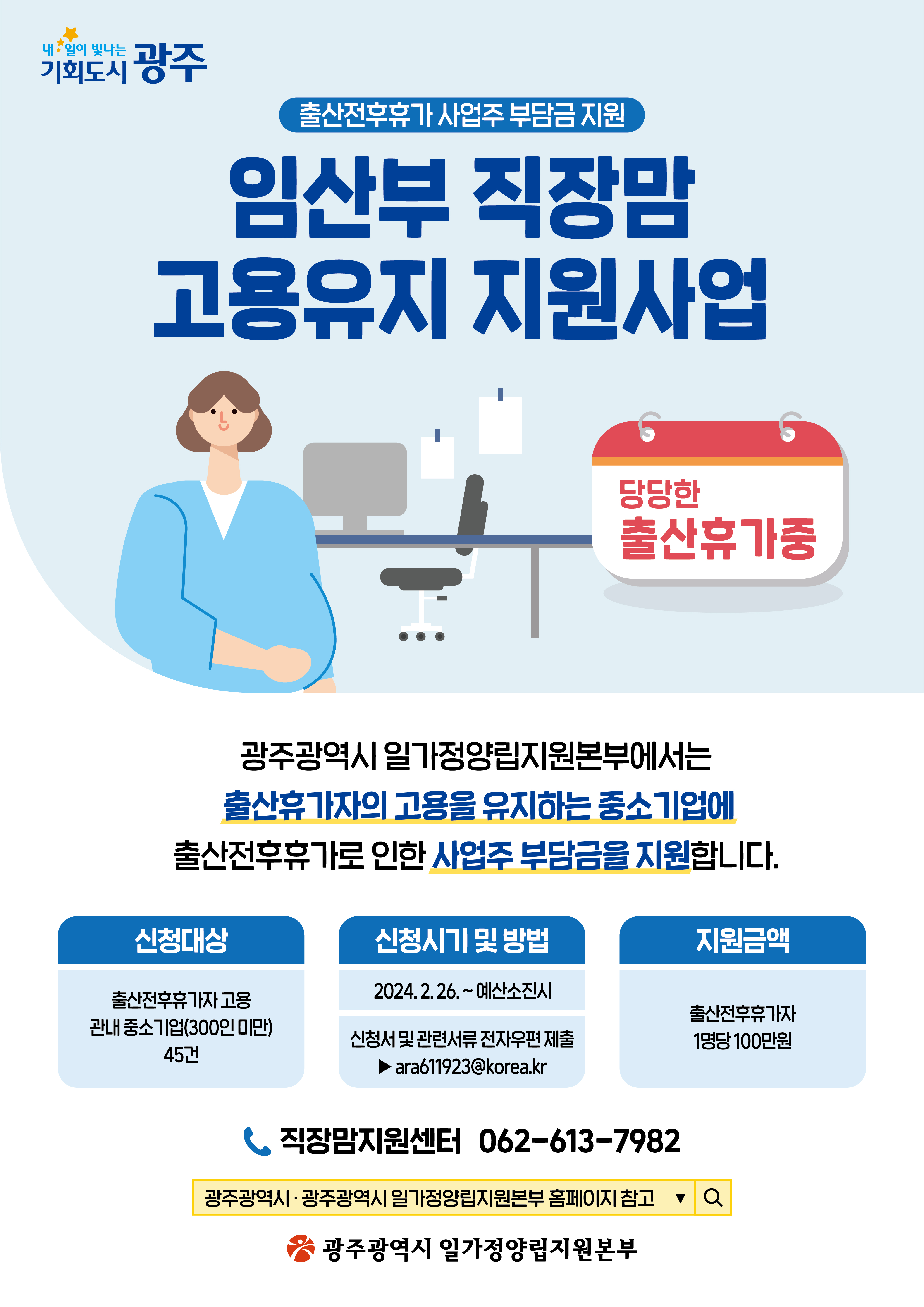 광주광역시일가정양립지원본부는 임산부 고용을 유지하는 중소기업을 대상으로 ‘임산부 직장맘 고용유지 지원금’을 지원한다.
