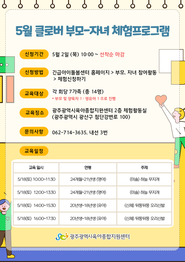home 맘편한 내★일, 광주아이키움2.0 결혼·임신·출생 영유아 초·중·고 다양한 가족 일생활균형 커뮤니티 아동돌봄지원 소통방 나눔방 광주 아이키움 상담방 돌봄정보방 성폭력 피해 상담 및 사건지원 공지사항 우리동네 돌봄정보 기관별 공지사항 [공통부모교육] 5월 부모-자녀 체험 프로그램 등록일 : 2024-04-24 00:00 작성자 : 운영자 조회수 : 91 5월 부모-자녀 체험활동.jpg 다운로드 목록