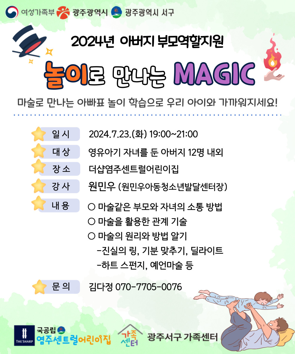 home 맘편한 내★일, 광주아이키움2.0 결혼·임신·출생 영유아 초·중·고 다양한 가족 일생활균형 커뮤니티 아동돌봄지원 소통방 나눔방 광주 아이키움 상담방 돌봄정보방 성폭력 피해 상담 및 사건지원 공지사항 우리동네 돌봄정보 기관별 공지사항 [서구] "놀이로 만나는 MAGIC" 아빠표 놀이!! 마술 배우러 오세요^^ 등록일 : 2024-07-18 15:31 작성자 : 운영자 조회수 : 64 아버지 부모역할지원으로 마술 배우러 오세요~~!!!아빠표 마술 놀이를 통해 자녀와 가까워 지는 계기를 마련하세요~!!♥인스타 11팔로워를 보유하고 계시는 강사님께서 아버지 놀이에 대해서 상세히 알려드립니다!!!(※마술도구는 센터에서 지원해드립니다.!!) 목록