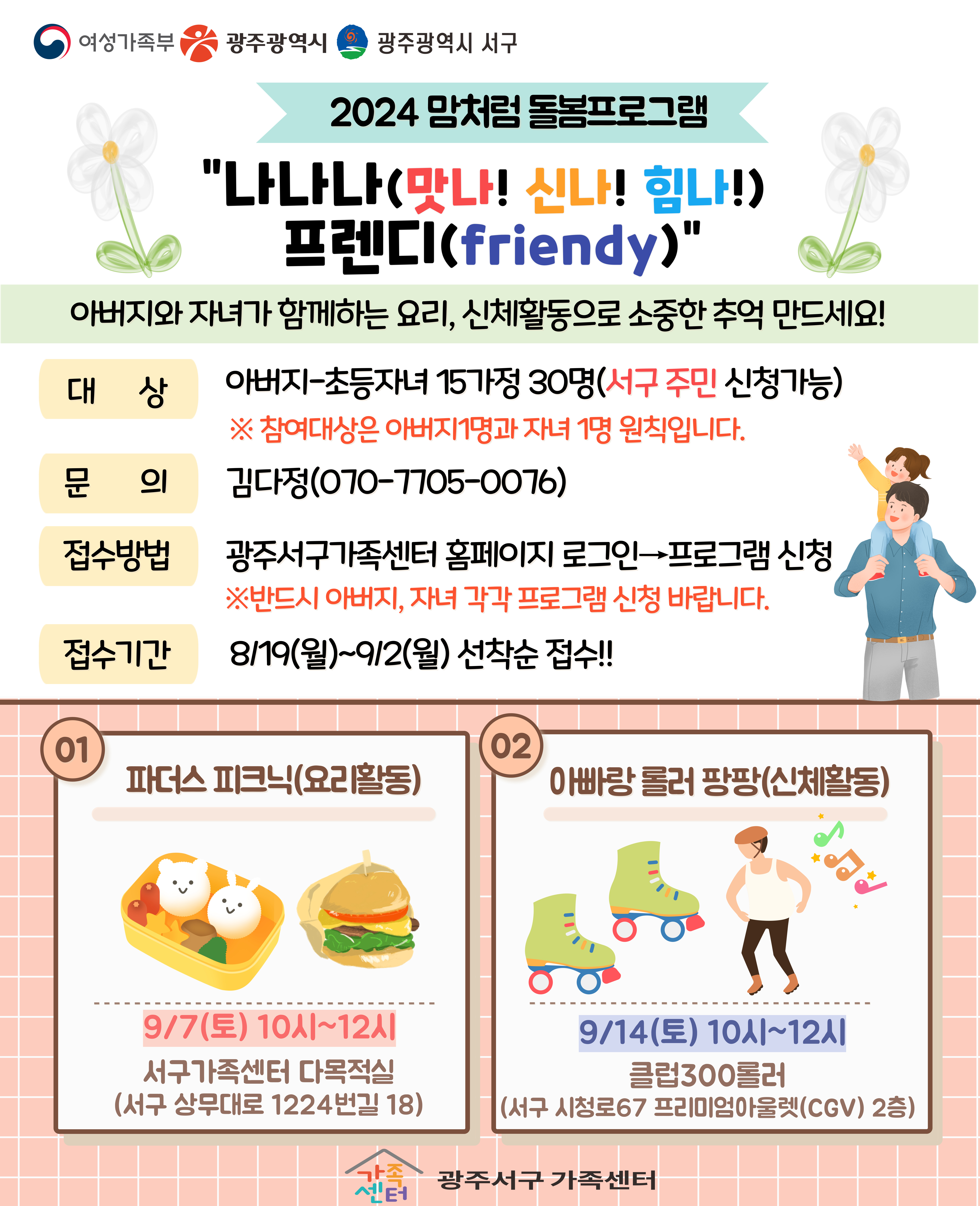 home 맘편한 내★일, 광주아이키움2.0 결혼·임신·출생 영유아 초·중·고 다양한 가족 일생활균형 커뮤니티 아동돌봄지원 소통방 나눔방 광주 아이키움 상담방 돌봄정보방 성폭력 피해 상담 및 사건지원 공지사항 우리동네 돌봄정보 기관별 공지사항 [광주서구가족센터] 아버지-자녀가 함께하는 요리활동, 신체활동 프로그램 참여하세요~!! 등록일 : 2024-08-19 16:01 작성자 : 서구가족센터 조회수 : 63 https://gjseogu.familynet.or.kr/center/lay1/program/S295T322C451/recruitReceipt/view.do?seq=169486 목록