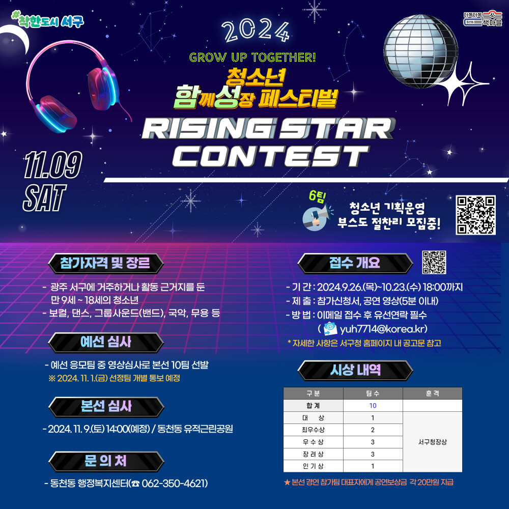 home 맘편한 내★일, 광주아이키움2.0 결혼·임신·출생 영유아 초·중·고 다양한 가족 일생활균형 커뮤니티 아동돌봄지원 소통방 나눔방 광주 아이키움 상담방 돌봄정보방 성폭력 피해 상담 및 사건지원 공지사항 우리동네 돌봄정보 기관별 공지사항 2024년 청소년 함성 페스티벌 라이징스타 콘테스트 참가자 모집 등록일 : 2024-09-27 00:00 작성자 : 운영자 조회수 : 55 다운로드다운로드 목록