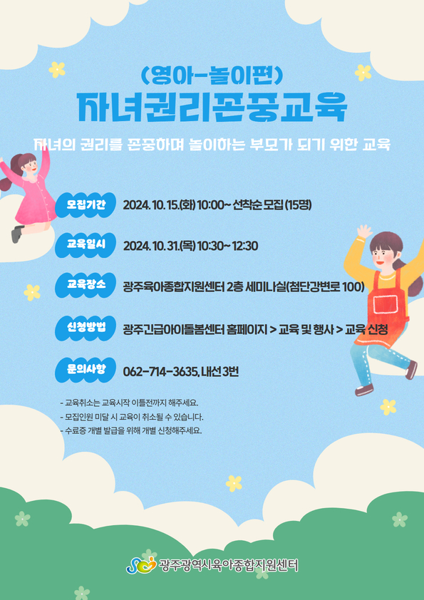 home 맘편한 내★일, 광주아이키움2.0 결혼·임신·출생 영유아 초·중·고 다양한 가족 일생활균형 커뮤니티 아동돌봄지원 소통방 나눔방 광주 아이키움 상담방 돌봄정보방 성폭력 피해 상담 및 사건지원 공지사항 우리동네 돌봄정보 기관별 공지사항 [공통부모교육] (영아-놀이편) 자녀권리존중교육 등록일 : 2024-10-15 00:00 작성자 : 운영자 조회수 : 58 자녀권리존중교육.jpg 다운로드 목록