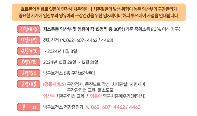 home 맘편한 내★일, 광주아이키움2.0 결혼·임신·출생 영유아 초·중·고 다양한 가족 일생활균형 커뮤니티 아동돌봄지원 소통방 나눔방 광주 아이키움 상담방 돌봄정보방 성폭력 피해 상담 및 사건지원 공지사항 우리동네 돌봄정보 기관별 공지사항 맘&베이비 해피투쓰데이 대상자 모집 등록일 : 2024-11-01 13:39 작성자 : 운영자 조회수 : 61 호르몬의 변화로 잇몸이 민감해 치은염이나 치주질환의 발생 위험이 높은임산부의 구강관리가 중요한 시기에 임산부와 영유아의 구강건강을 위한맘&베이비 해피 투쓰데이 사업을 안내합니다. <출처 : 광주 남구청> 목록