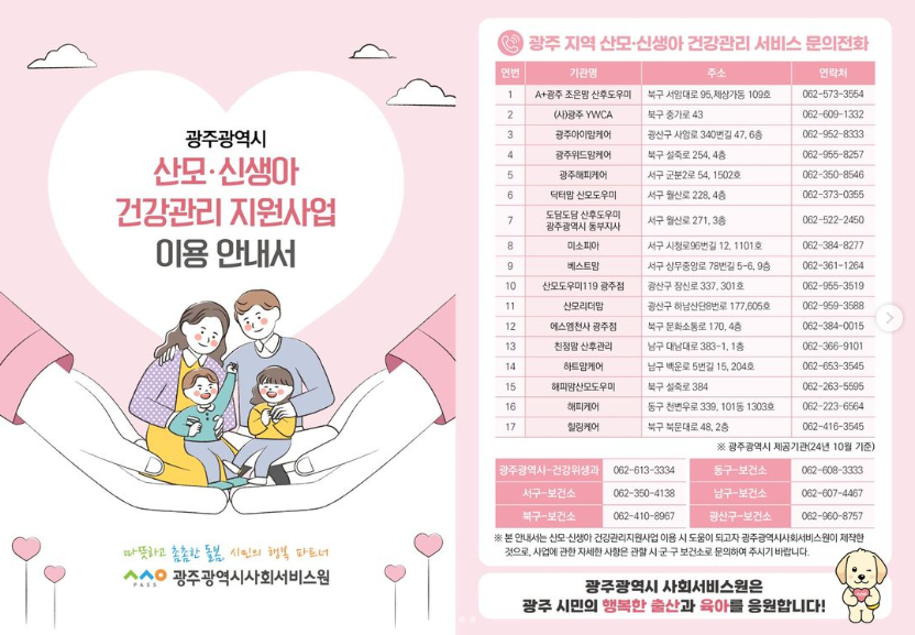 home 맘편한 내★일, 광주아이키움2.0 결혼·임신·출생 영유아 초·중·고 다양한 가족 일생활균형 커뮤니티 아동돌봄지원 소통방 나눔방 광주 아이키움 상담방 돌봄정보방 성폭력 피해 상담 및 사건지원 공지사항 우리동네 돌봄정보 기관별 공지사항 광주광역시 산모신생아건강관리 지원사업 이용 안내서 등록일 : 2024-11-14 15:20 작성자 : 운영자 조회수 : 55 <출처 : 광주사회서비스원> 목록