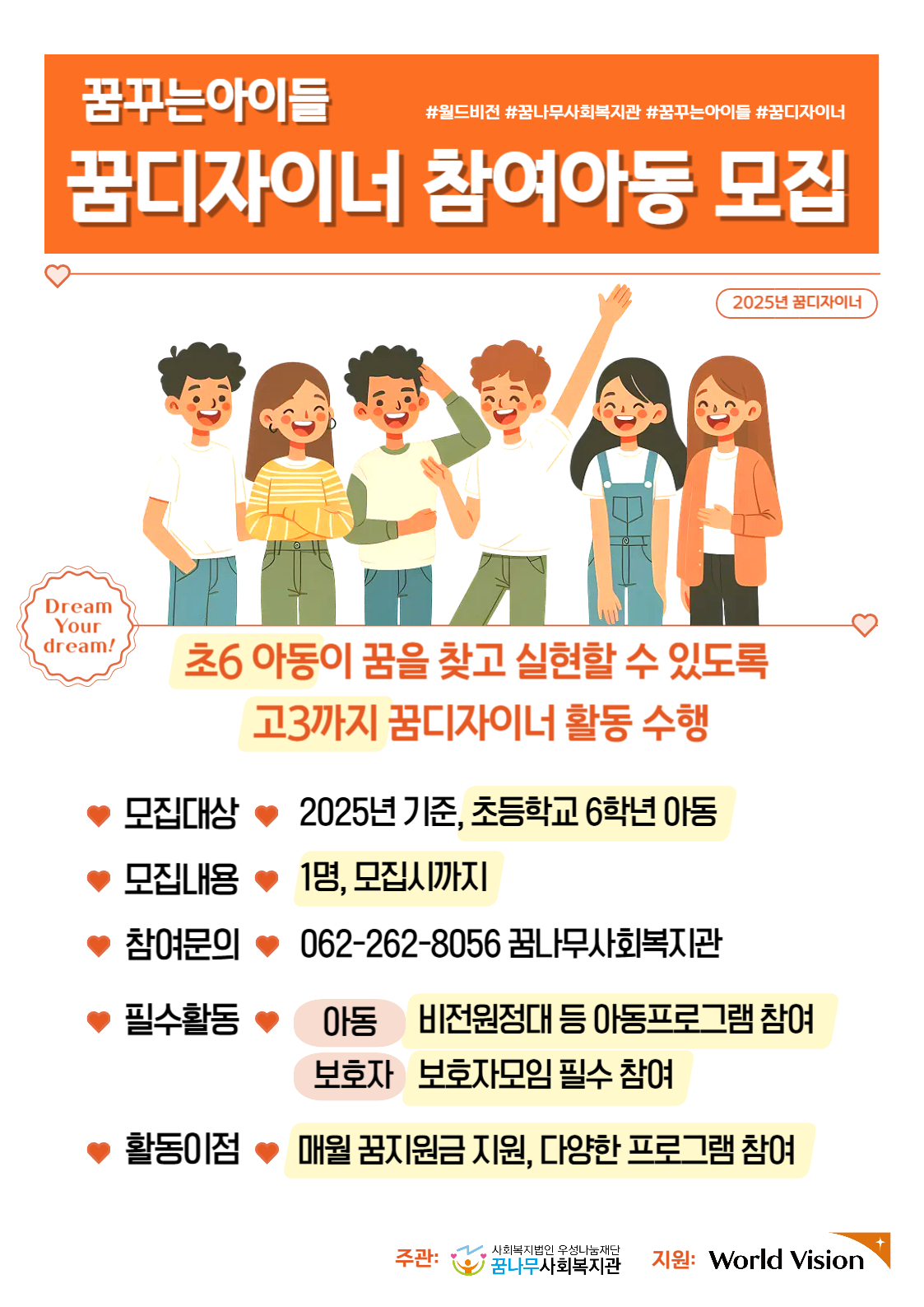 월드비전과 함께하는 꿈디자이너 사업에 참여할 아동을 모집하고 있습니다.