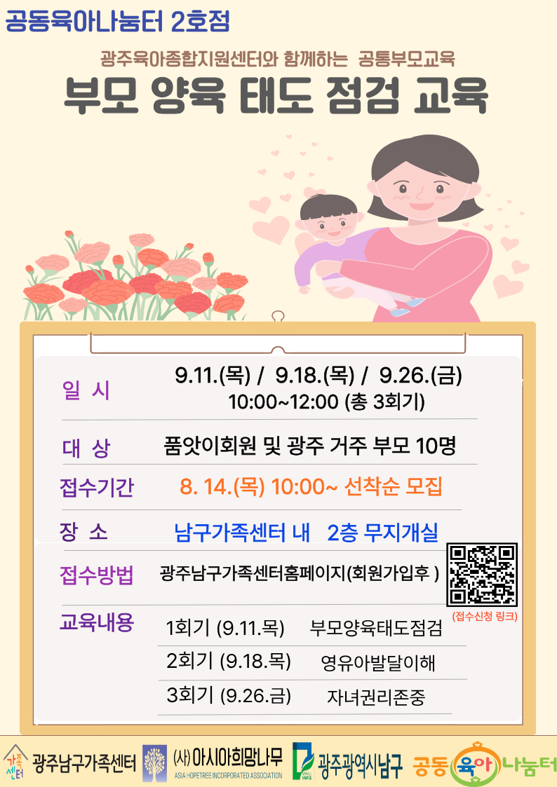 공동육아나눔터 2호점에서 광주육아종합지원센터와 함께하는 공통부모교육이 진행됩니다.