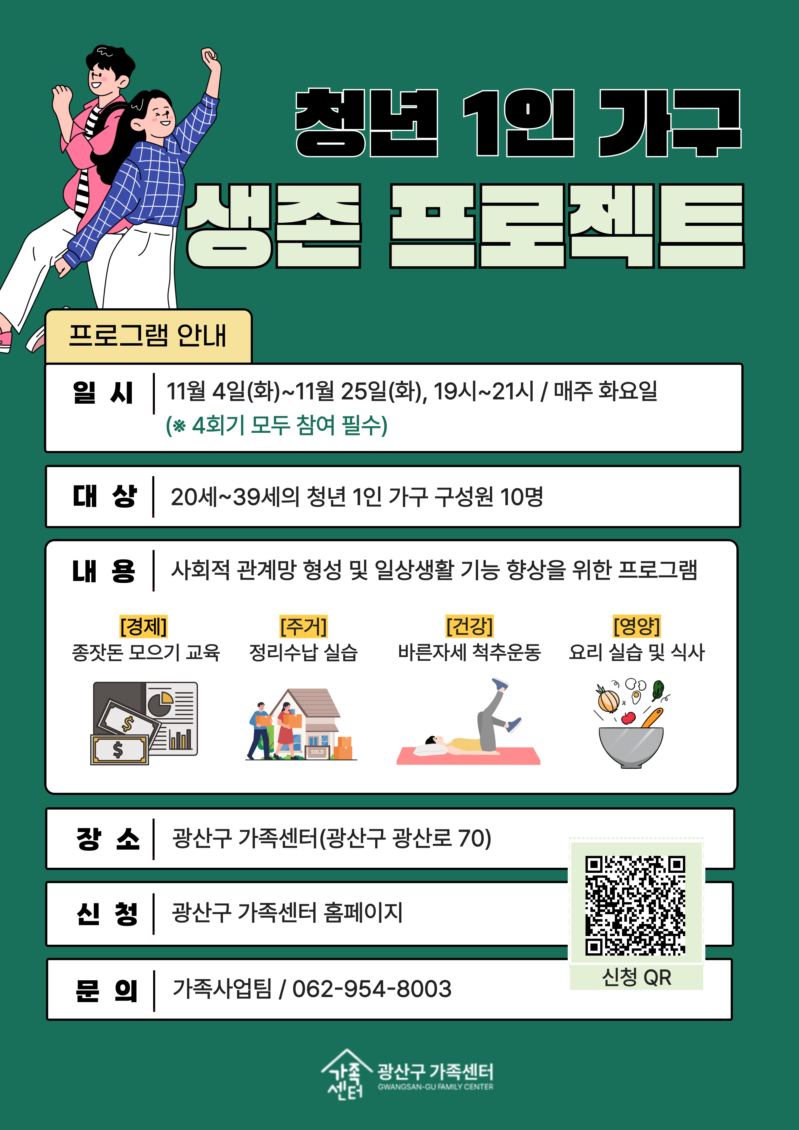 home 맘편한 내★일, 광주아이키움2.0 결혼·임신·출생 영유아 초·중·고 다양한 가족 일생활균형 커뮤니티 아동돌봄지원 소통방 나눔방 광주 아이키움 상담방 돌봄정보방 성폭력 피해 상담 및 사건지원 공지사항 우리동네 돌봄정보 기관별 공지사항 [광산구 가족센터] 청년 1인가구 생존 프로젝트 참여자 모집(무료) 등록일 : 2025-10-31 11:25 작성자 : 광산구가족센터 조회수 : 16 광산구 가족센터에서 청년 1인가구를 대상으로경제 / 주거(정리수납) / 건강 / 영양 을 주제로 원데이 클래스를 진행합니다.광산구 가족센터 홈페이지에서 신청 가능 합니다.^0^ 목록