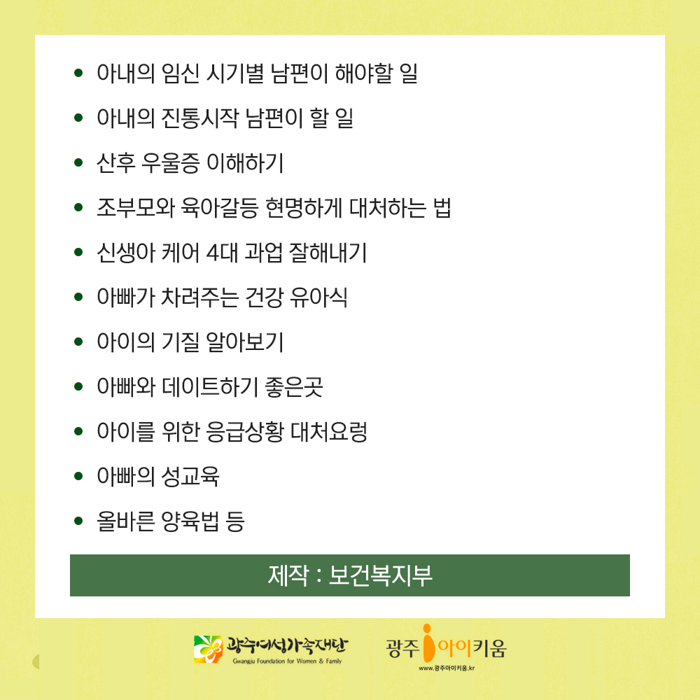 home 맘편한 내★일, 광주아이키움2.0 결혼·임신·출생 영유아 초·중·고 다양한 가족 일생활균형 커뮤니티 아동돌봄지원 소통방 나눔방 광주 아이키움 상담방 돌봄정보방 성폭력 피해 상담 및 사건지원 공지사항 이벤트소식 참여게시판 카드뉴스 동영상 아이키움 칼럼 성평등 육아웹툰 로고&캐릭터 초보아빠를 위한 육아가이드 책자 무료배부 등록일 : 2023-01-17 16:07 작성자 : 운영자 조회수 : 914 첨부파일 KakaoTalk_20230109_145032833_01.jpg 다운로드 목록