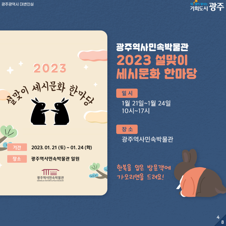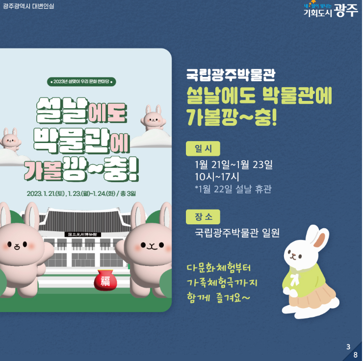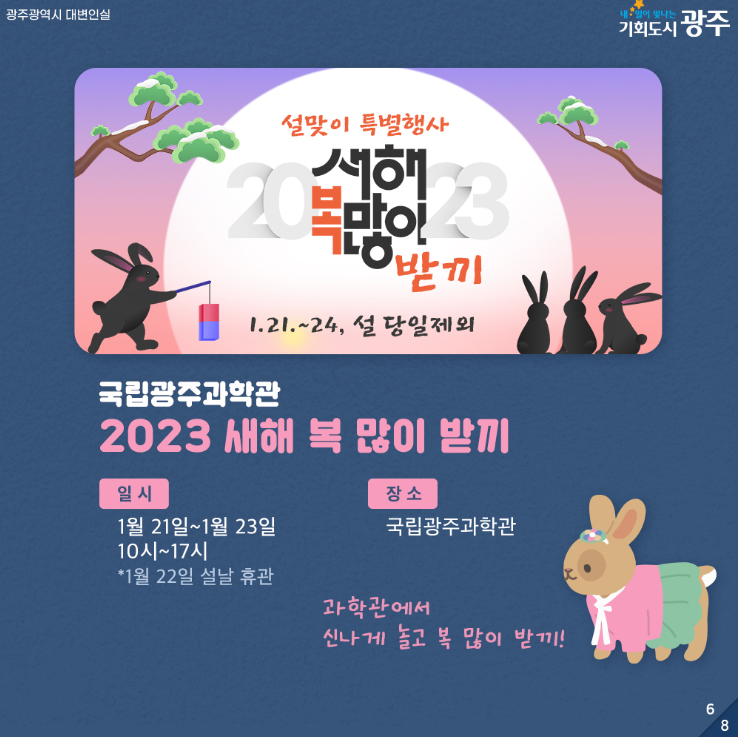 home 맘편한 내★일, 광주아이키움2.0 결혼·임신·출생 영유아 초·중·고 다양한 가족 일생활균형 커뮤니티 아동돌봄지원 소통방 나눔방 광주 아이키움 상담방 돌봄정보방 성폭력 피해 상담 및 사건지원 공지사항 이벤트소식 참여게시판 카드뉴스 동영상 아이키움 칼럼 성평등 육아웹툰 로고&캐릭터 [광주광역시] 설맞이 문화행사 한눈에 보기 등록일 : 2023-01-20 09:31 작성자 : 운영자 조회수 : 721 첨부파일 화면 캡처 2023-01-20 092536.png 다운로드 목록
