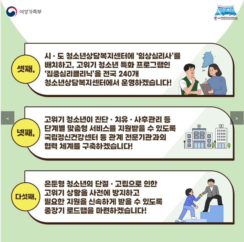 home 맘편한 내★일, 광주아이키움2.0 결혼·임신·출생 영유아 초·중·고 다양한 가족 일생활균형 커뮤니티 아동돌봄지원 소통방 나눔방 광주 아이키움 상담방 돌봄정보방 성폭력 피해 상담 및 사건지원 공지사항 이벤트소식 참여게시판 카드뉴스 동영상 아이키움 칼럼 성평등 육아웹툰 로고&캐릭터 [여성가족부] 청소년 마음건강을 돌보겠습니다 등록일 : 2023-03-22 10:24 작성자 : 운영자 조회수 : 711 첨부파일 화면 캡처 2023-03-22 102309.png 다운로드 목록