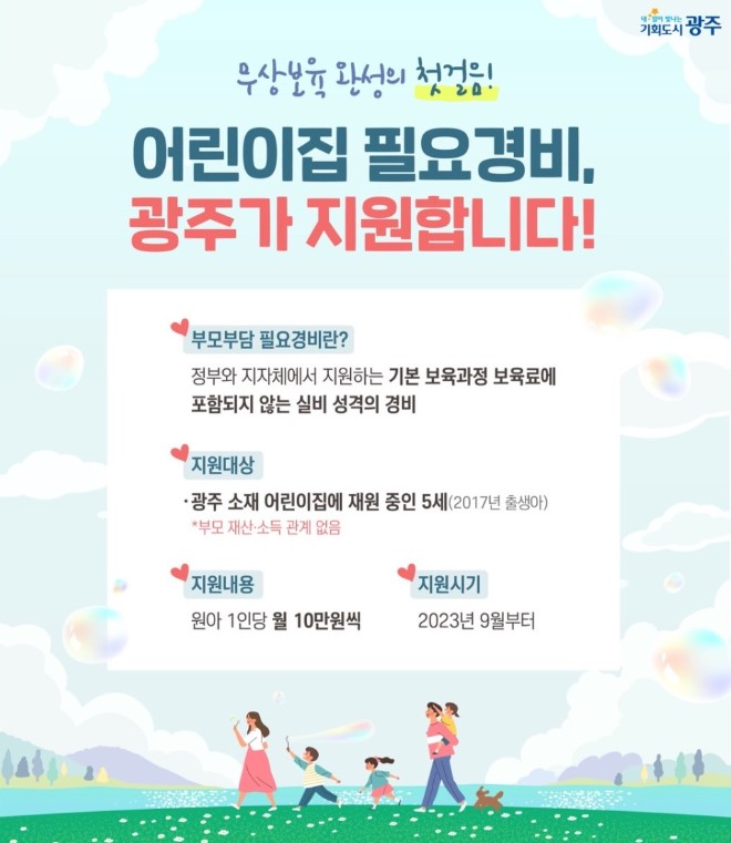 광주광역시가 어린이집에 재원 중인 아동 학부모의 양육, 보육비용 부담을 덜기 위해 9월부터 부모부담 필요경비를 지원합니다.