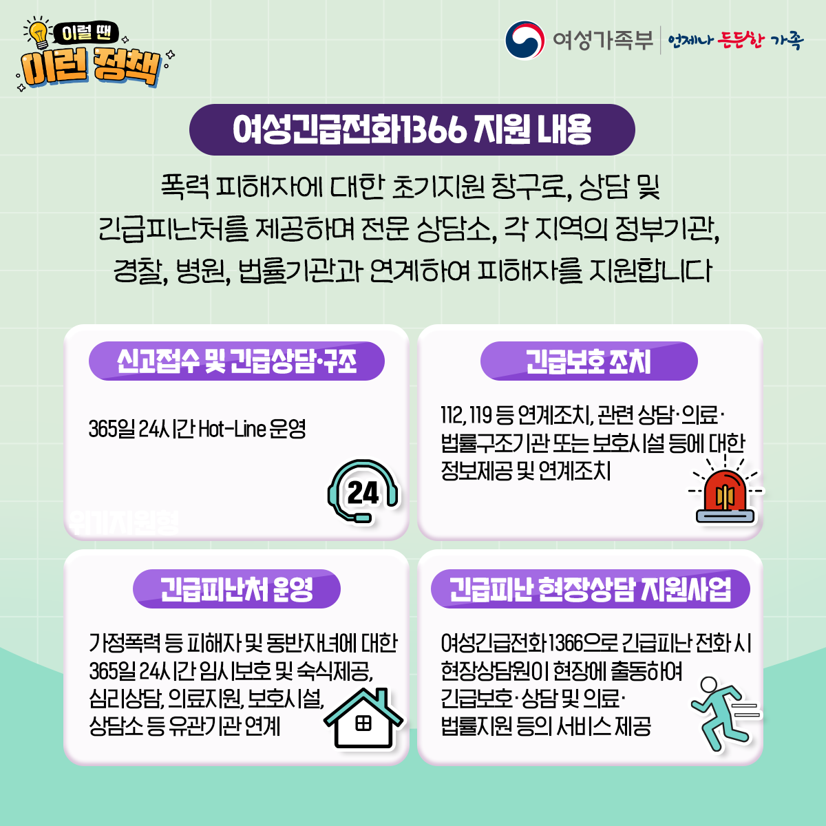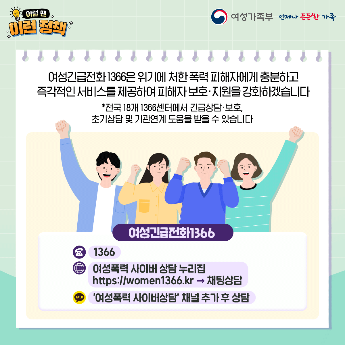 home 맘편한 내★일, 광주아이키움2.0 결혼·임신·출생 영유아 초·중·고 다양한 가족 일생활균형 커뮤니티 아동돌봄지원 소통방 나눔방 광주 아이키움 상담방 돌봄정보방 성폭력 피해 상담 및 사건지원 공지사항 이벤트소식 참여게시판 카드뉴스 동영상 아이키움 칼럼 성평등 육아웹툰 로고&캐릭터 [여성가족부] 여성긴급전화 1366 등록일 : 2023-10-04 17:40 작성자 : 운영자 조회수 : 637 첨부파일 여성의전화-1.png 다운로드 목록