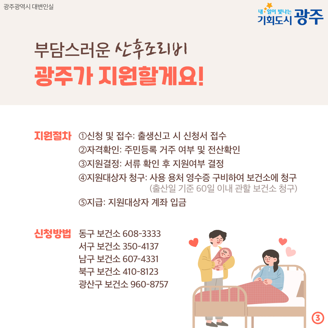 home 맘편한 내★일, 광주아이키움2.0 결혼·임신·출생 영유아 초·중·고 다양한 가족 일생활균형 커뮤니티 아동돌봄지원 소통방 나눔방 광주 아이키움 상담방 돌봄정보방 성폭력 피해 상담 및 사건지원 공지사항 이벤트소식 참여게시판 카드뉴스 동영상 아이키움 칼럼 성평등 육아웹툰 로고&캐릭터 광주형 산후조리비 지원🍼 등록일 : 2024-07-11 15:31 작성자 : 운영자 조회수 : 575 첨부파일 광주형산후조리비 (1).jpg 다운로드 목록