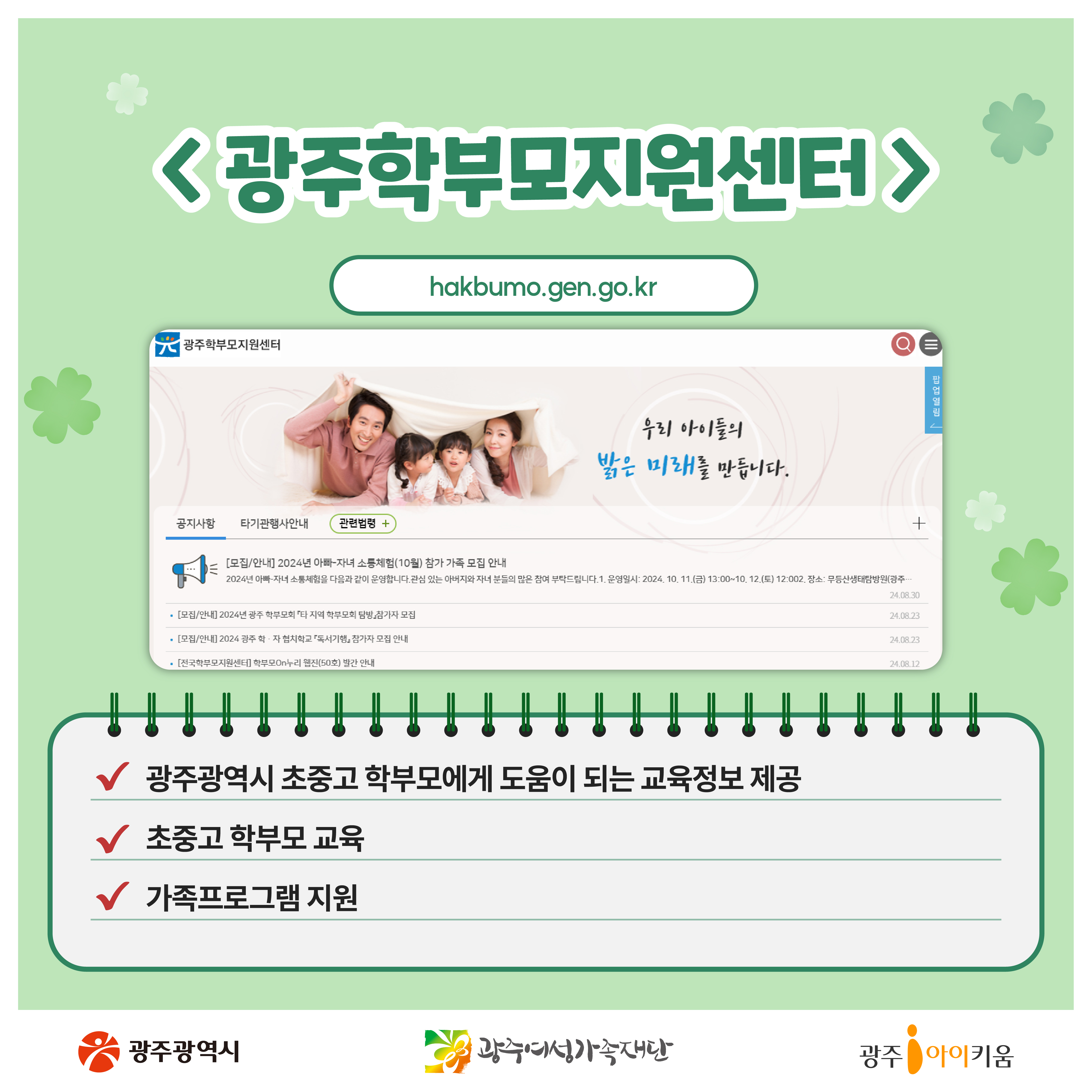 home 맘편한 내★일, 광주아이키움2.0 결혼·임신·출생 영유아 초·중·고 다양한 가족 일생활균형 커뮤니티 아동돌봄지원 소통방 나눔방 광주 아이키움 상담방 돌봄정보방 성폭력 피해 상담 및 사건지원 공지사항 이벤트소식 참여게시판 카드뉴스 동영상 아이키움 칼럼 성평등 육아웹툰 로고&캐릭터 [돌봄같이 59호] 아는 만큼 보이는 육아정보 플랫폼 등록일 : 2024-09-12 16:39 작성자 : 운영자 조회수 : 427 첨부파일 KakaoTalk_20240912_163153255.jpg 다운로드 목록