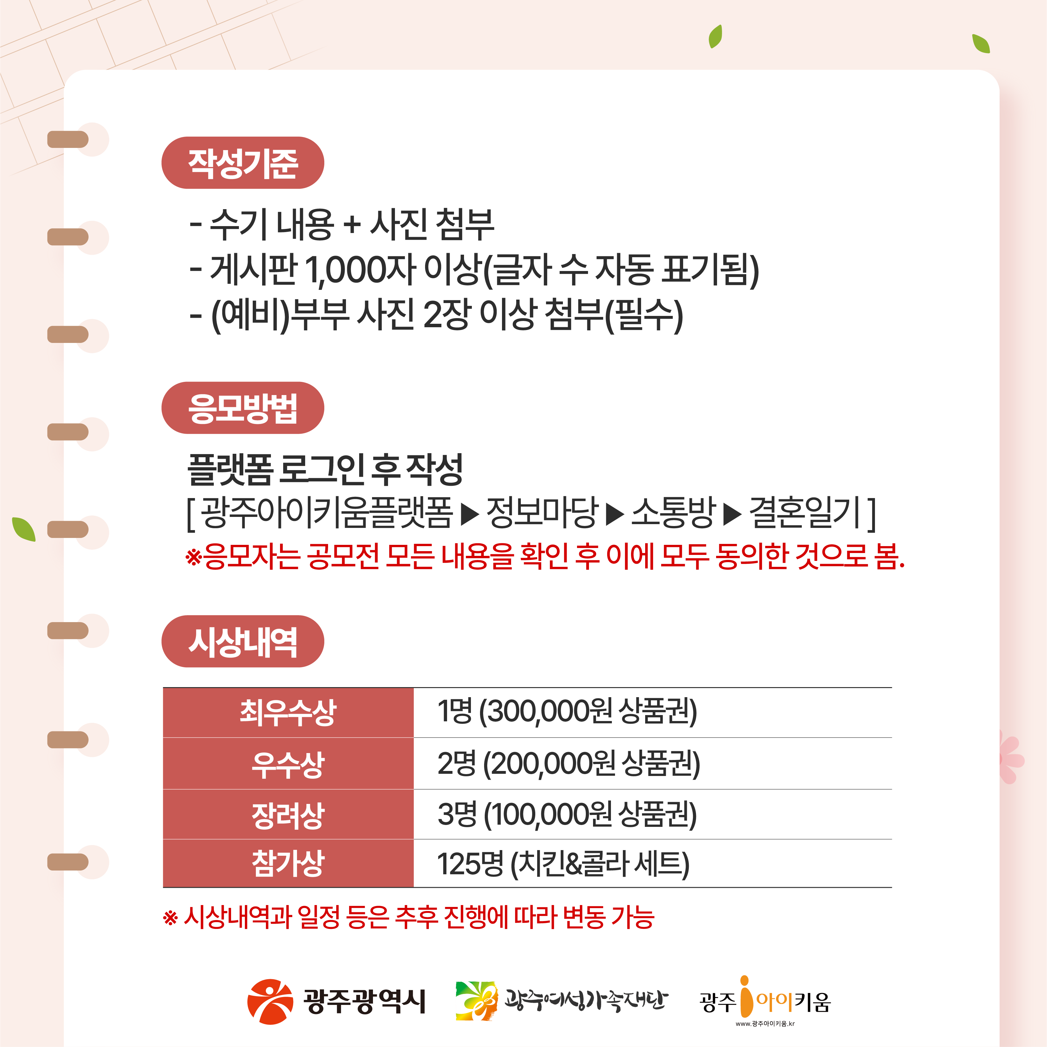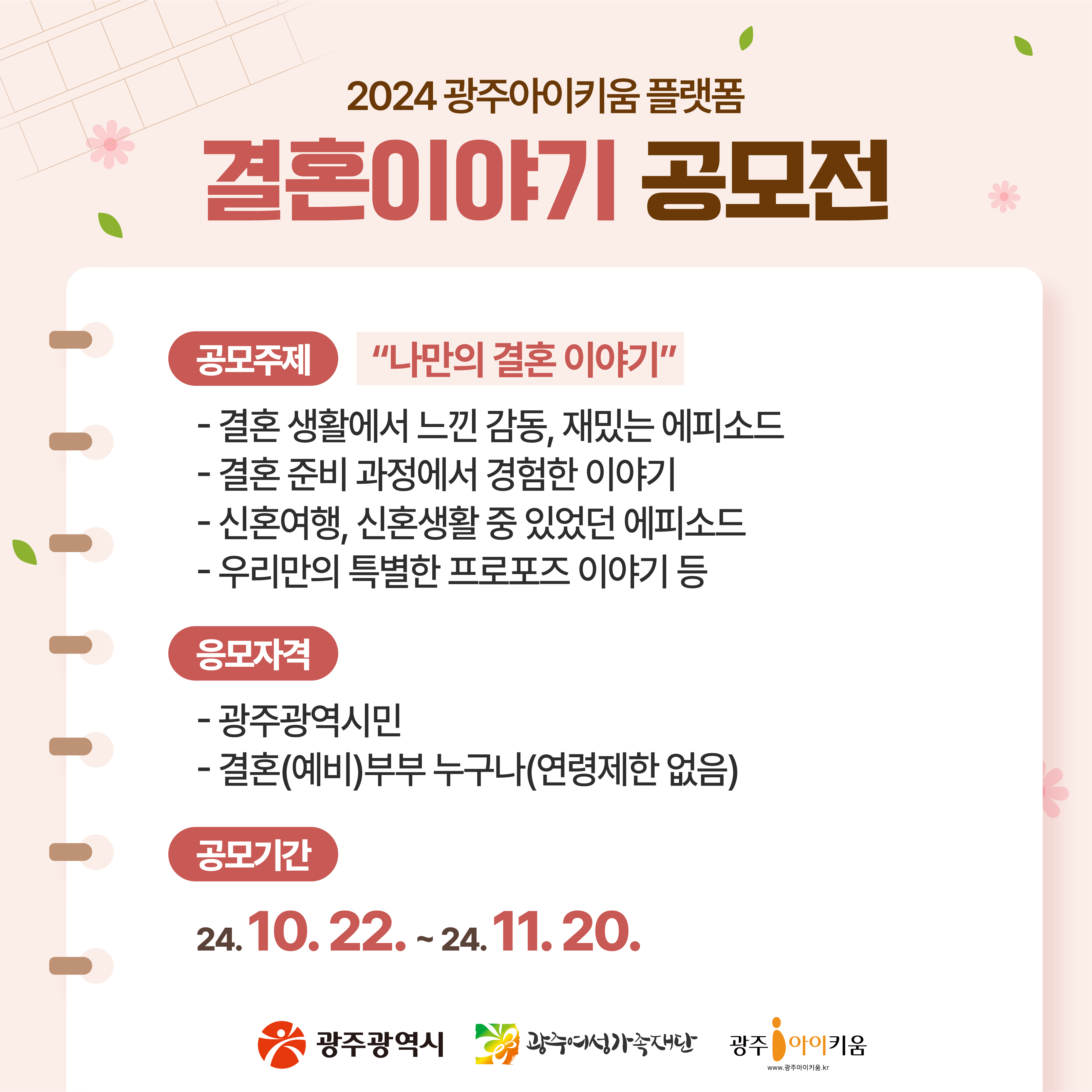 home 맘편한 내★일, 광주아이키움2.0 결혼·임신·출생 영유아 초·중·고 다양한 가족 일생활균형 커뮤니티 아동돌봄지원 소통방 나눔방 광주 아이키움 상담방 돌봄정보방 성폭력 피해 상담 및 사건지원 공지사항 이벤트소식 참여게시판 카드뉴스 동영상 아이키움 칼럼 성평등 육아웹툰 로고&캐릭터 ✨[참여행사] 2024 결혼이야기 공모전✨ 등록일 : 2024-10-21 12:44 작성자 : 운영자 조회수 : 564 첨부파일 KakaoTalk_20241021_101938882.png 다운로드 목록