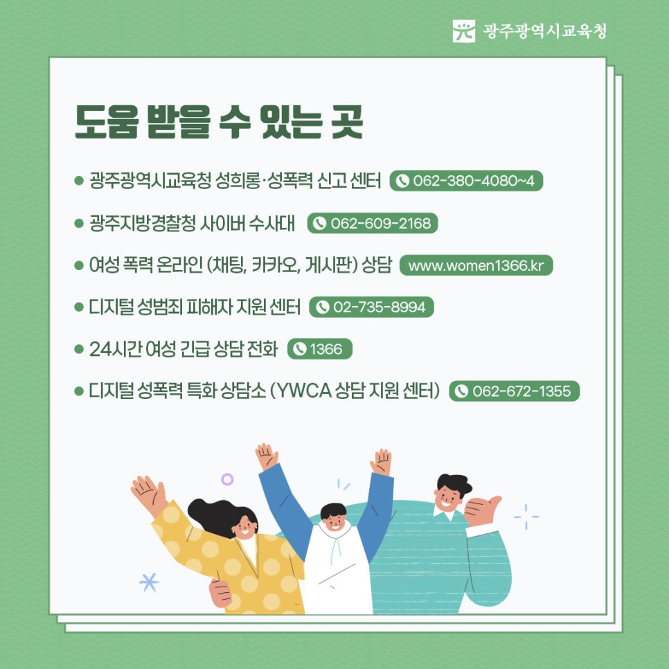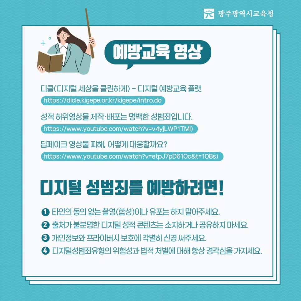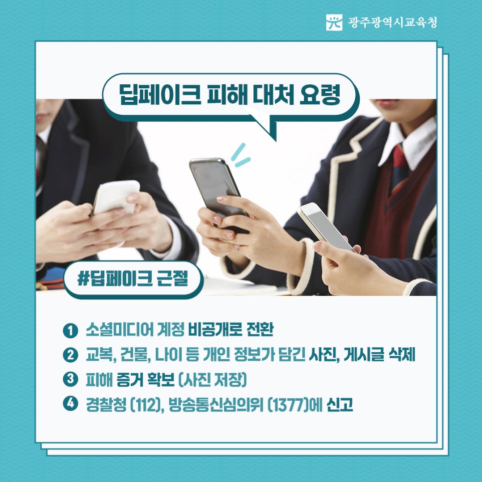 home 맘편한 내★일, 광주아이키움2.0 결혼·임신·출생 영유아 초·중·고 다양한 가족 일생활균형 커뮤니티 아동돌봄지원 소통방 나눔방 광주 아이키움 상담방 돌봄정보방 성폭력 피해 상담 및 사건지원 공지사항 이벤트소식 참여게시판 카드뉴스 동영상 아이키움 칼럼 성평등 육아웹툰 로고&캐릭터 💻디지털 성범죄 딥페이크 등록일 : 2024-11-04 15:47 작성자 : 운영자 조회수 : 265 첨부파일 딥페이크1.jpg 다운로드 [출처 : 광주광역시교육청] 목록