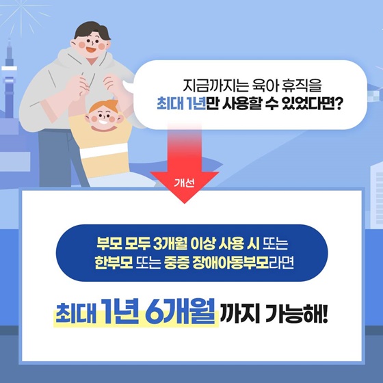 Ⅴ 부모 모두 3개월 이상 사용 시 또는 한부모 또는 중증 장애아동부모라면 최대 1년 → 최대 1년 6개월 까지 가능!