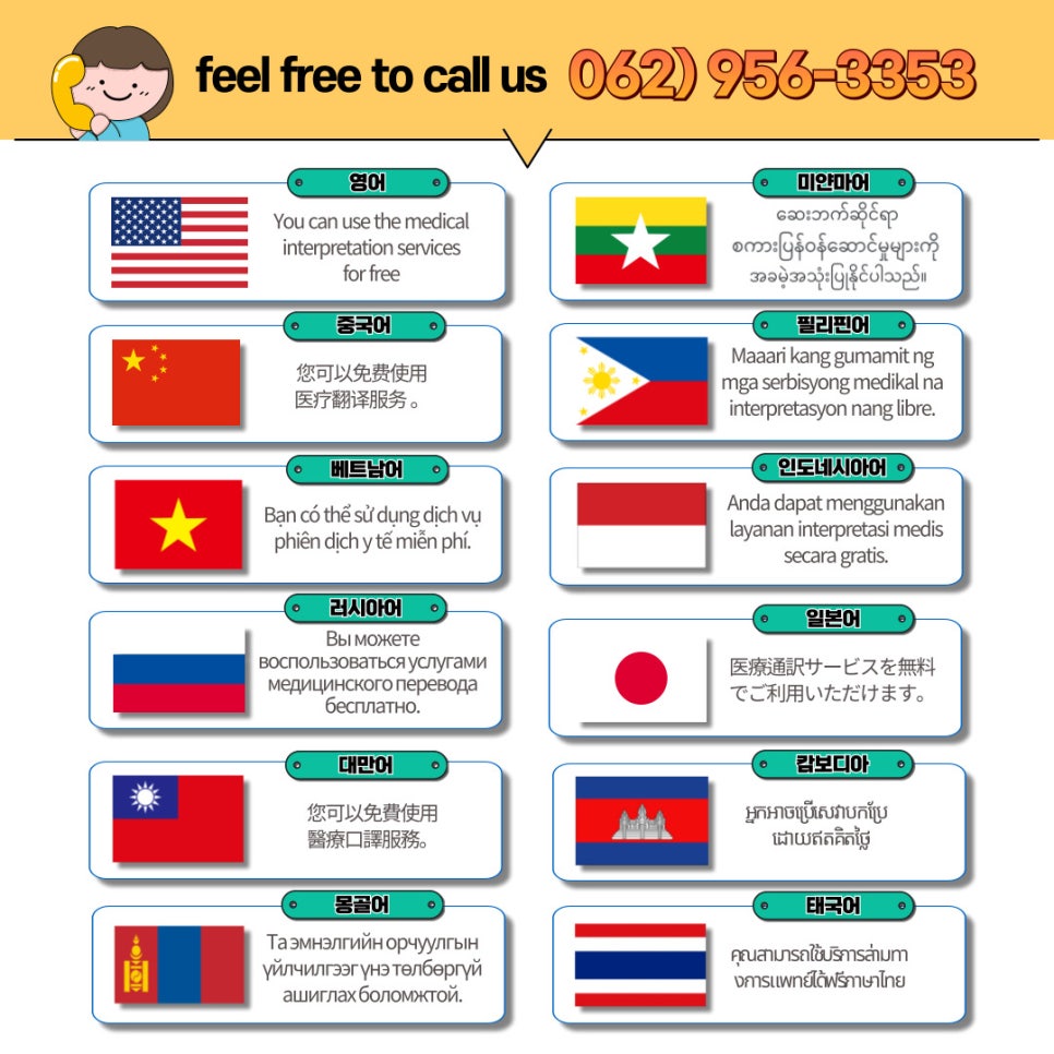home 맘편한 내★일, 광주아이키움2.0 결혼·임신·출생 영유아 초·중·고 다양한 가족 일생활균형 커뮤니티 아동돌봄지원 소통방 나눔방 광주 아이키움 상담방 돌봄정보방 성폭력 피해 상담 및 사건지원 공지사항 이벤트소식 참여게시판 카드뉴스 동영상 아이키움 칼럼 성평등 육아웹툰 로고&캐릭터 외국인 주민의 의료접근성을 UP! 광주 의료통번역서비스 등록일 : 2024-12-20 14:21 작성자 : 운영자 조회수 : 269 첨부파일 01.png 다운로드 외국인 주민의 의료접근성을 UP! 광주 의료통번역서비스[출처] 외국인 주민의 의료접근성을 UP! 광주 의료통번역서비스|작성자 광주광역시 목록