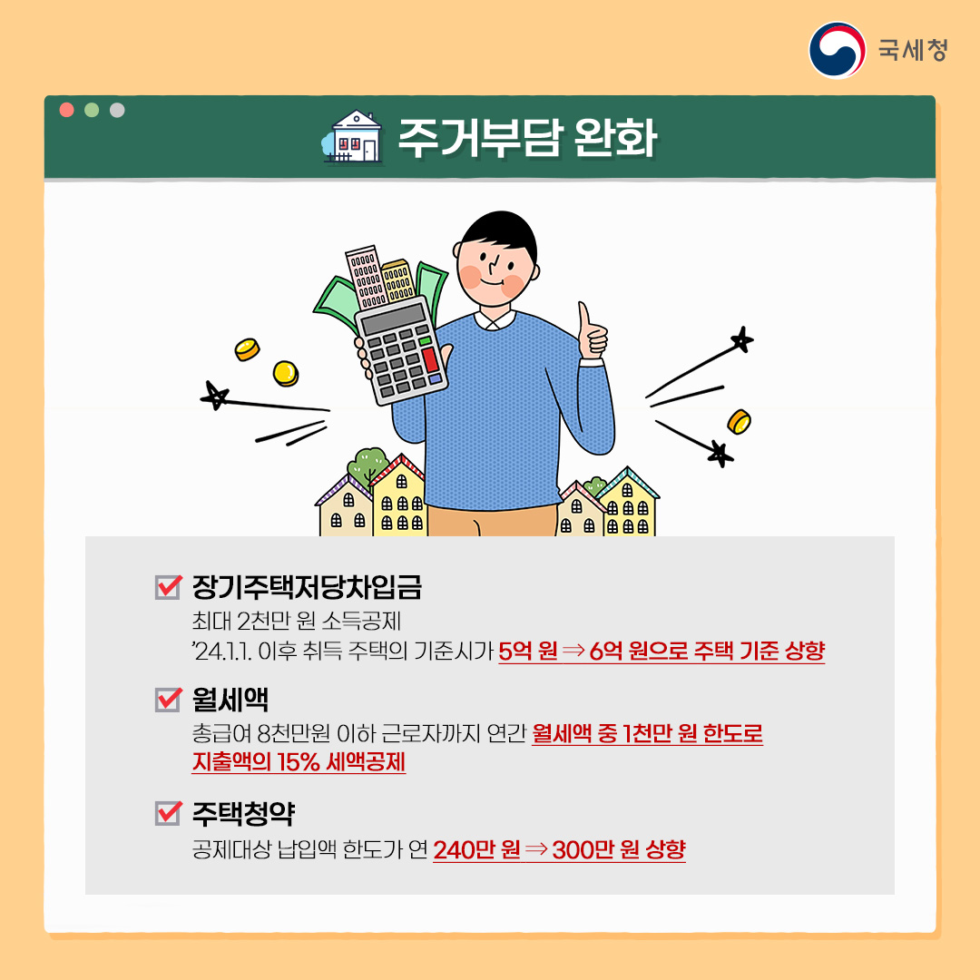 · 주택청약: 공제대상 납입액 한도가 연 240만 원→300만 원 상향