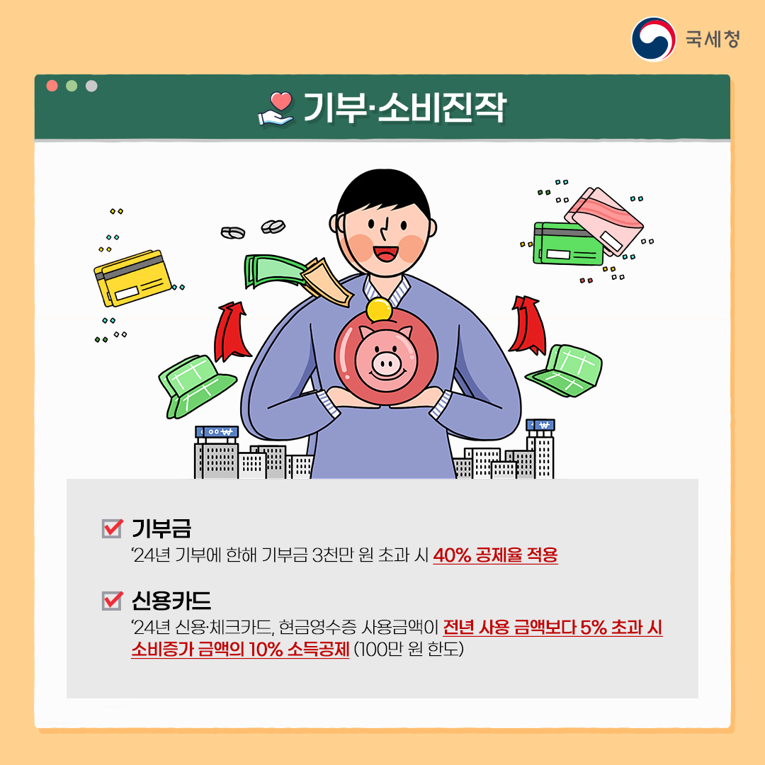 · 신용카드: ’24년 신용·체크카드, 현금영수증 사용금액이 전년 사용 금액보다 5% 초과 시 소비증가 금액의 10% 소득공제 (100만 원 한도)
