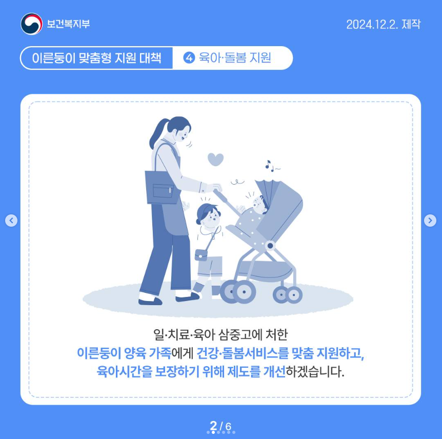 일·치료·육아 삼중고에 처한 이른둥이 양육 가족에게 건강·돌봄서비스를 맞춤 지원하고, 육아시간을 보장하기 위해 제도를 개선하겠습니다.