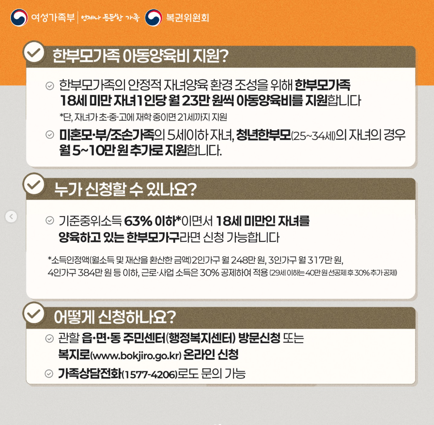 · 한부모가족의 안정적 자녀양육 환경 조성을 위해 한부모가족 18세 미만 자녀 1인당 월 23만 원씩 아동양육비를 지원합니다